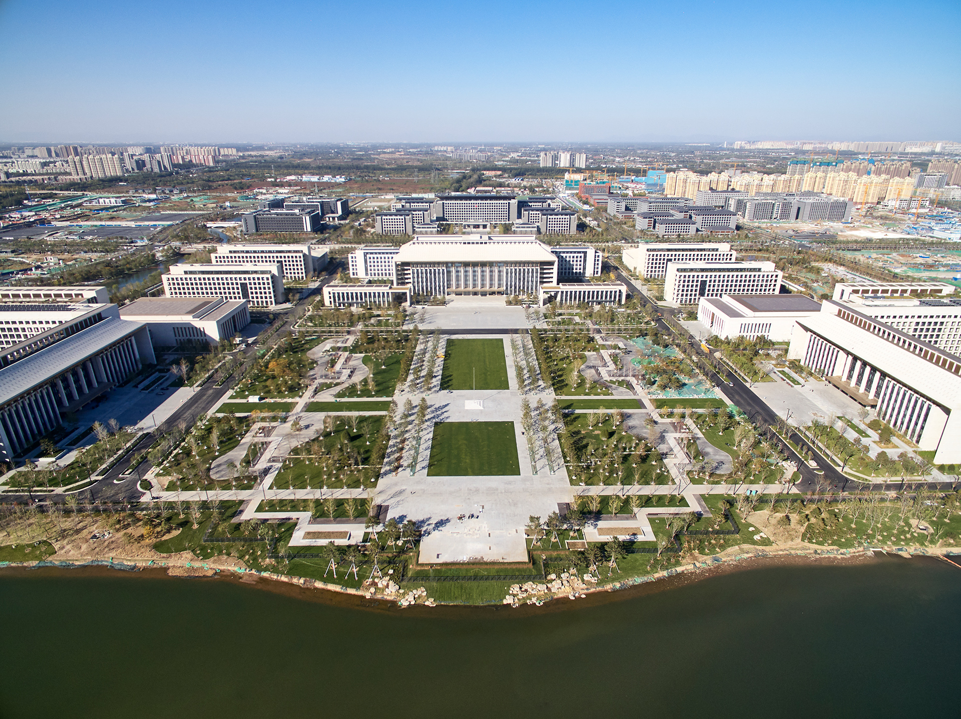 行政辦公啟動(dòng)區(qū)采用對(duì)稱(chēng)式的布局形式,使群體建筑形成明確的秩序感。沿中軸線南北規(guī)劃了層次遞進(jìn)的院落結(jié)構(gòu),前后獨(dú)立又相互呼應(yīng)。市委辦公區(qū)布置在中軸的重要位置,與人大和政協(xié)辦公區(qū)形成中軸序列上的第一進(jìn)院落;市政府與委辦局辦公區(qū),形成北側(cè)的第二進(jìn)院落。兩個(gè)院落之間有開(kāi)闊的綠化空間并采用微地形設(shè)計(jì)加以區(qū)隔。
