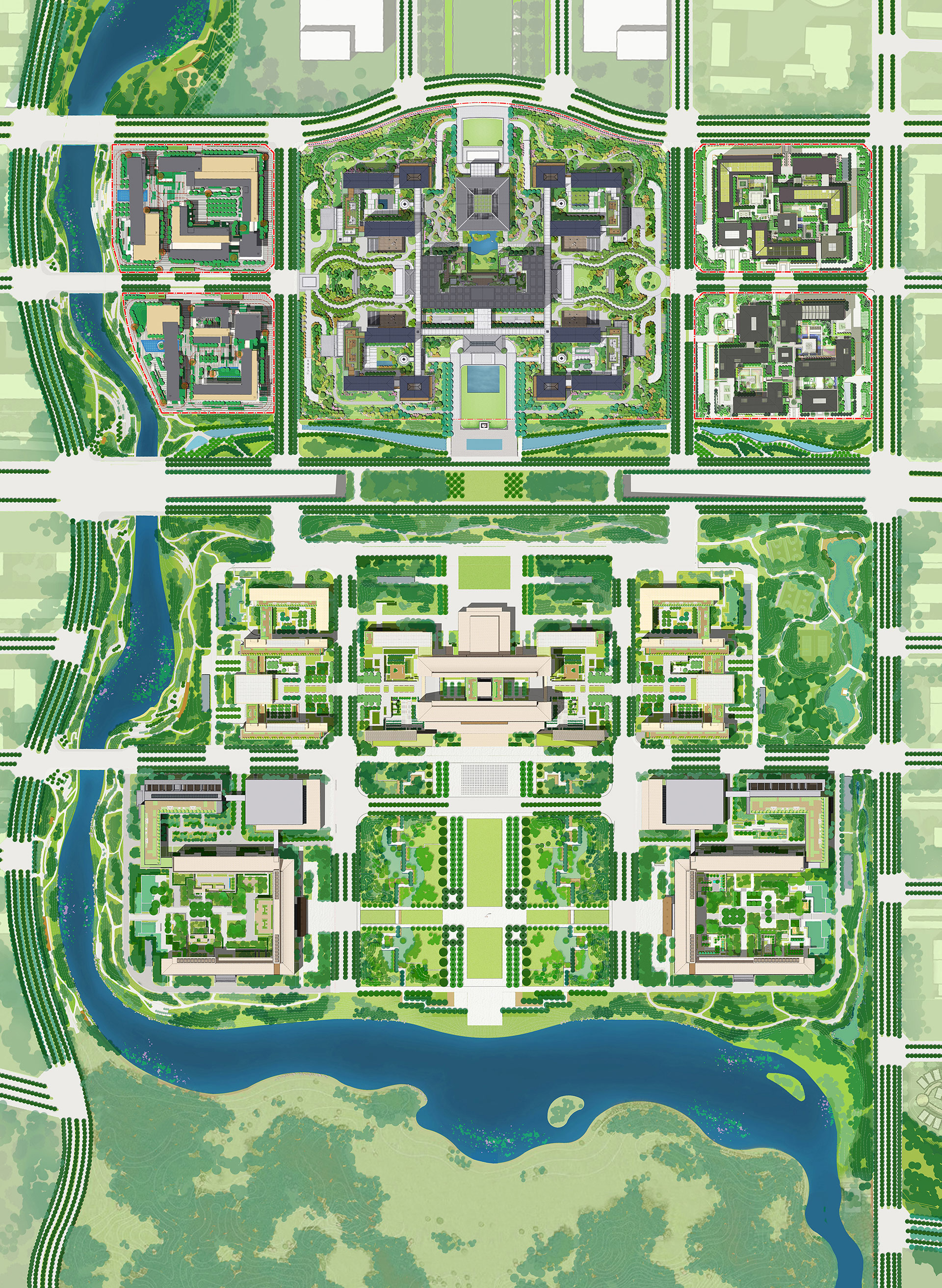 規(guī)劃設(shè)計(jì)遵循對(duì)稱(chēng)格局、院落布局、山水環(huán)繞、中國(guó)建筑的設(shè)計(jì)思想,深化開(kāi)展并實(shí)施落實(shí)
