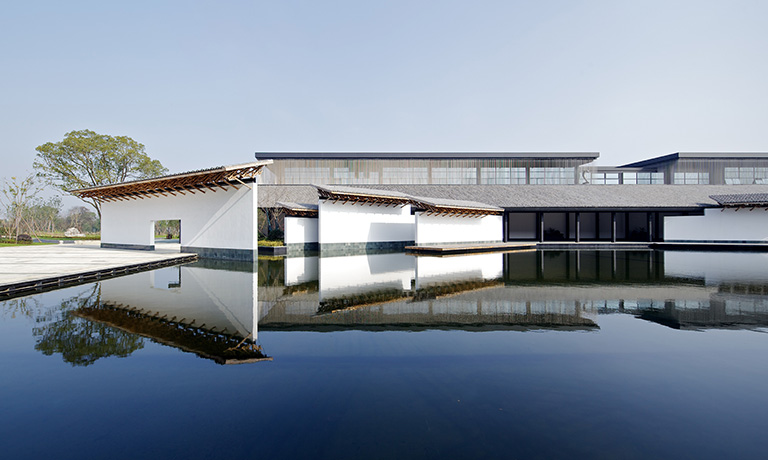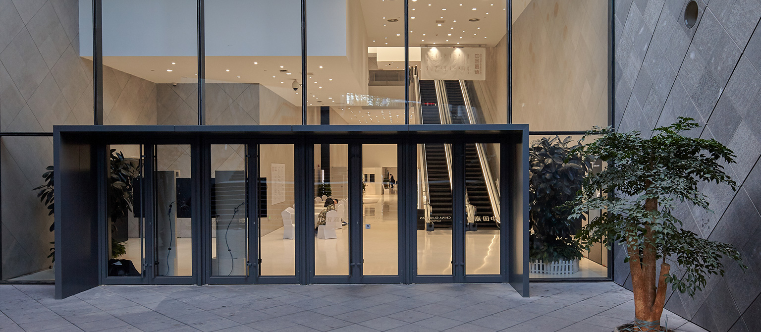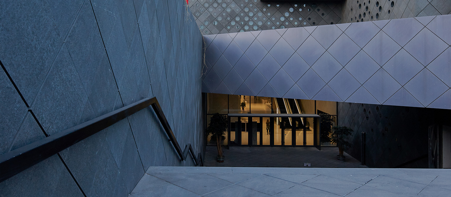 外幕墻首層至四層為菱形間隔單元式石材幕墻系統(tǒng),上部4-8層外立面為錯(cuò)縫玻璃幕墻預(yù)制型小單元系統(tǒng)。圓形雙面玻璃鏡筒內(nèi)置LED燈鑲嵌在深灰色石材幕墻上,抽象的呈現(xiàn)了中國元代畫家黃公望的富春山居圖。