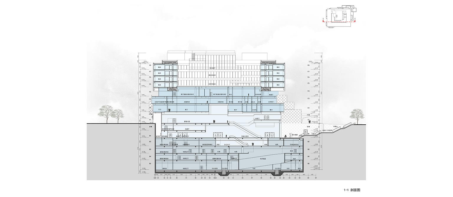 嘉德藝術(shù)中心為復(fù)雜超限高層建筑工程,地下5層,最大埋深28.5m,地上9 層,總高37.0 米,建筑面積約5.6萬平米。結(jié)構(gòu)體系復(fù)雜:混凝土筒體小,結(jié)構(gòu)跨度大,轉(zhuǎn)換結(jié)構(gòu)多,上部酒店層均通過懸挑功能實(shí)現(xiàn),懸挑跨度大、層數(shù)多。建筑功能多,限制條件多,層高低而凈高需求大。