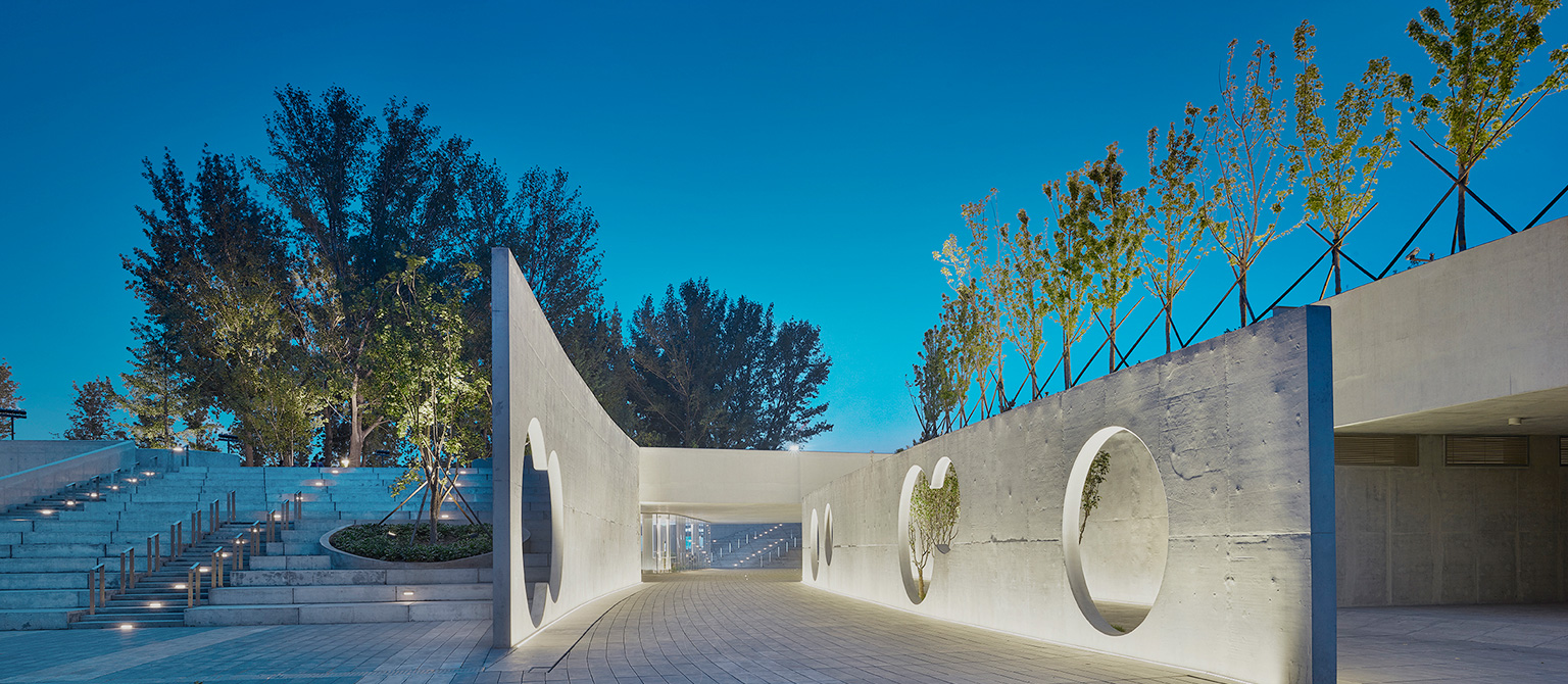 由于建筑位于公園內(nèi)部,方案以現(xiàn)代建筑語言結(jié)和傳統(tǒng)中國園林意境,通過下沉手法將建筑主體“隱”于公園景觀綠植當(dāng)中,為平面化的傳統(tǒng)公園創(chuàng)造出多層次、豐富的空間體驗。通過簡單、明確的幾何關(guān)系將建筑主體、植栽池、小品、鋪裝等有機(jī)統(tǒng)一,局部覆土建筑和通透的玻璃立面模糊了室內(nèi)與室外,建筑與景觀的關(guān)系。