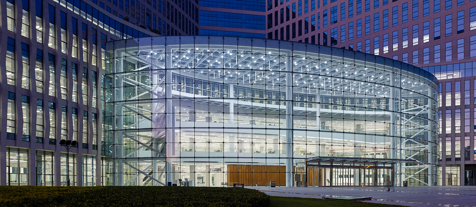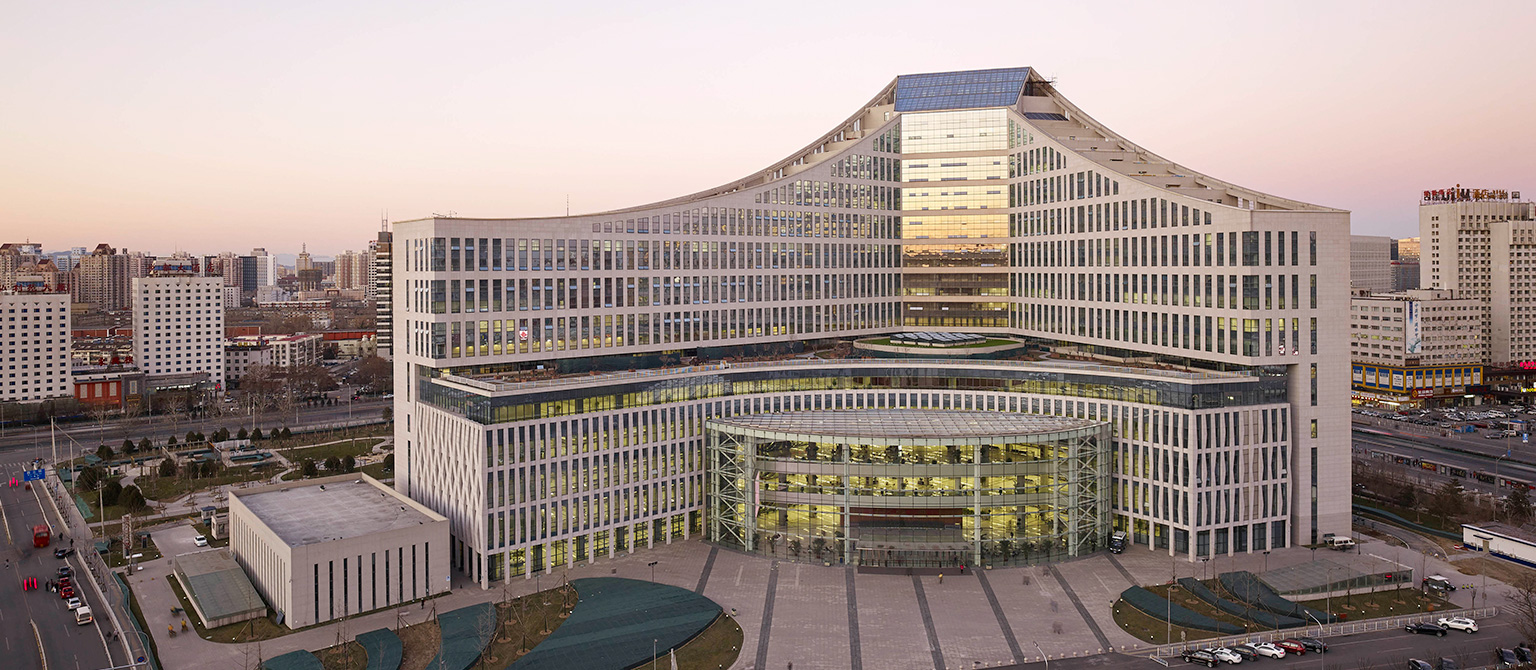 北京市政務(wù)中心,為一組辦公樓,最長方向長度接近200m,整個(gè)建筑造型是一片斜屋頂,逐層升高的形狀。為保證結(jié)構(gòu)規(guī)則性,結(jié)構(gòu)通過設(shè)置結(jié)構(gòu)縫,將地上建筑劃分工廠7個(gè)單獨(dú)的建筑。其中辦公樓劃分為4個(gè)單獨(dú)的主樓,辦公主樓采用混凝土框架剪力墻結(jié)構(gòu),盡量在核心筒和分縫處設(shè)置剪力墻。為解決高樓混凝土柱截面過大的問題,在下部幾層柱中設(shè)置鋼骨。裙房通過設(shè)縫劃分成3個(gè)主樓。主要入口的葉子大廳采用鋼結(jié)構(gòu)。葉子大廳縱向長度69m 橫向長度23m。葉子大廳豎向和抗側(cè)力體系采用兩個(gè)大的鋼管三角桁架設(shè)置在葉子大廳兩端,屋面結(jié)構(gòu)為張懸梁結(jié)構(gòu),使整個(gè)屋頂結(jié)構(gòu)看起來比較輕巧通透。葉子大廳與裙房的部分連接采用滑動(dòng)支座。裙房五層采用框架結(jié)構(gòu),在裙房的頂層有一個(gè)跨度報(bào)告大廳,短向跨度25m,采用了預(yù)應(yīng)力混凝土梁結(jié)構(gòu)。整個(gè)建筑基礎(chǔ)采用了梁筏基礎(chǔ),本工程持力層為卵石層,承載力較高,最高塔樓22層也采用天然地基。由于地下室較深,抗浮水位較高,裙房部分存在抗浮問題,通過回填鋼渣回混凝土解決。