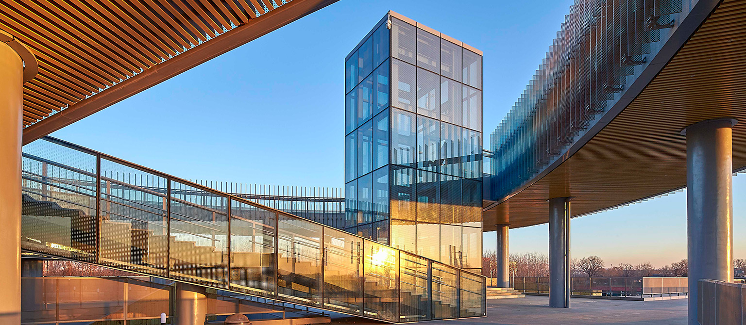 二層環(huán)廊,建筑造型要求為單排環(huán)形框架柱兩側(cè)懸挑鋼梁,兩側(cè)懸挑長度隨框架柱位置和板邊線的變化而變化,為提高結(jié)構(gòu)抗震性能,二層環(huán)廊采用鋼管混凝土柱框架結(jié)構(gòu),并進行中震彈性性能化設(shè)計,樓蓋采用密肋鋼梁+閉口型壓型鋼板組合樓承板,其中,鋼管混凝土柱內(nèi)澆注C40灌漿料,鋼管混凝土柱之間采用箱形鋼梁連接,并從鋼管混凝土柱和箱形鋼梁上懸挑工字形鋼梁。
