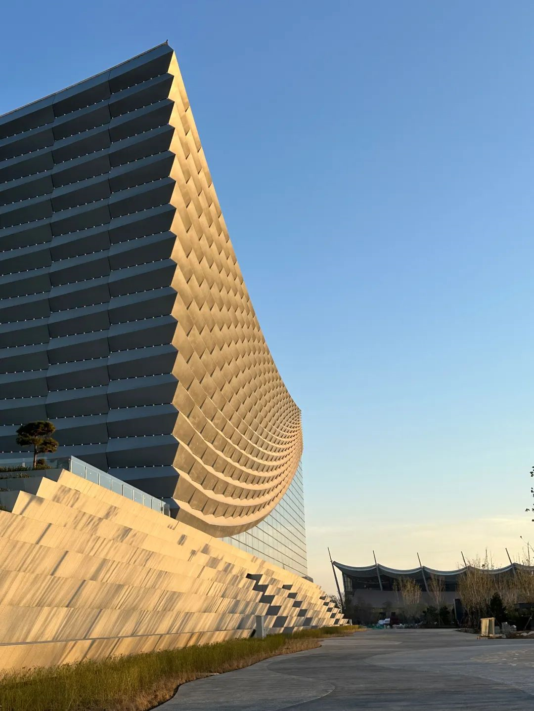 北京藝術中心最具視覺沖擊力的地方,就是外檐在陽光下呈現(xiàn)出美輪美奐的光影變化的“大幕拉開”的靈動意象,其設計靈感來源于通州古糧倉和運送物資的船舶,這些極具動感的曲面造型和屋頂輪廓,既是對于古糧倉建筑屋面曲線的寫意勾勒,也抽象地再現(xiàn)了古運河上運輸船只揚帆啟航的盛況。而“大幕拉開”的效果,是靠跨度超過155米的單層曲面鋼網(wǎng)殼的完美落架和4134塊不同的三角形幕墻單元嚴絲合縫拼接實現(xiàn)的。