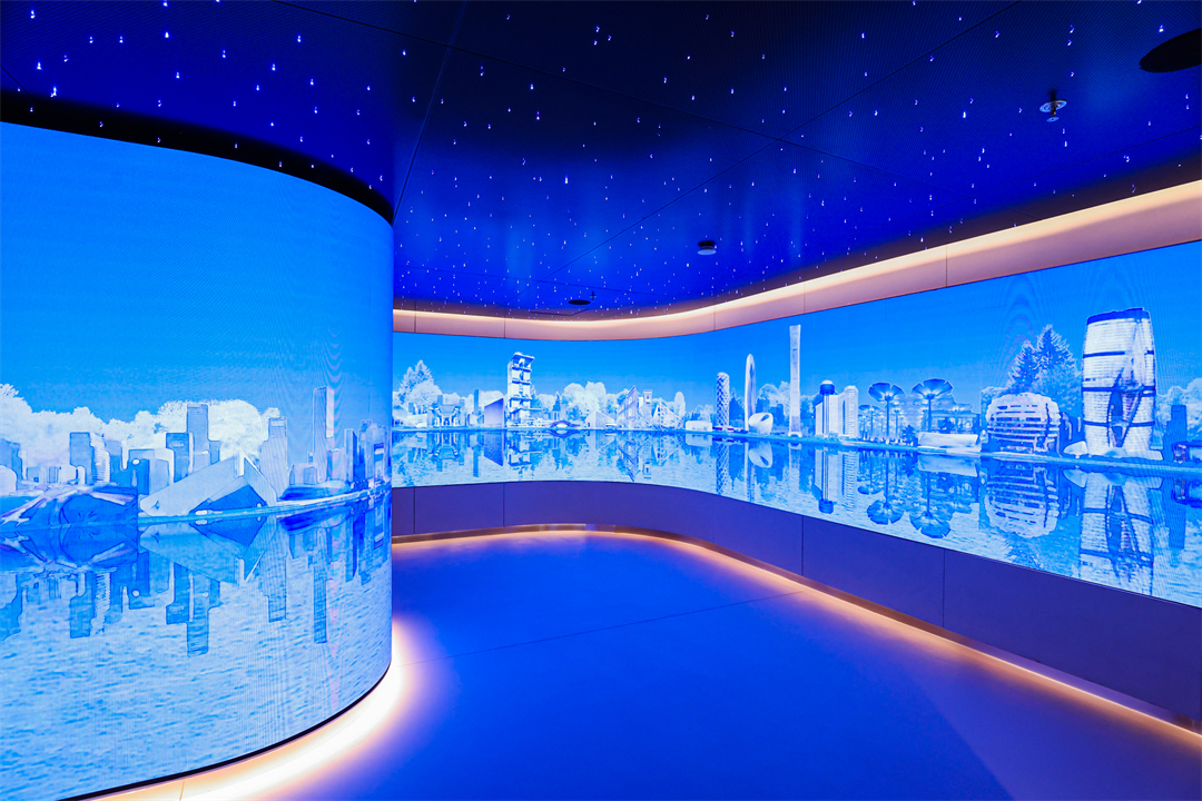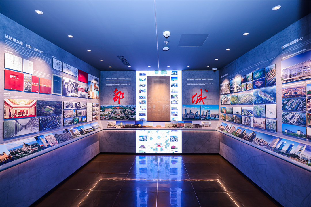 都與城:北京建院始終心系“都與城”,奉獻著睿智與精湛的作品。此區(qū)域采用故宮太和殿仿金磚地面,并用一條金線貫穿整個房間,正面墻銅板上印刻著故宮及建院設計的天安門廣場建筑群,并用屏幕及腰線展示從南北中軸線到東西長安街的重點項目。從保護中軸線建筑的測繪到參與“梁陳方案”,從響應北京城市總體規(guī)劃到城市副中心、雄安新區(qū)“新兩翼”的設計實踐,回應了“建設一個什么樣的首都,怎樣建設首都”的時代答卷。