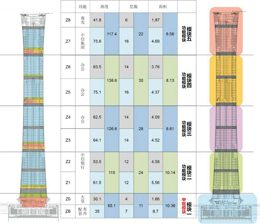 基于模塊劃分,在條件允許的情況下,所有系統(tǒng)應(yīng)按照模塊劃分的原則進(jìn)行設(shè)置。在設(shè)計(jì)中,首先基于模塊概念構(gòu)建關(guān)于建筑整體運(yùn)行的基礎(chǔ)性系統(tǒng),通過(guò)基礎(chǔ)性系統(tǒng)的建立保證每個(gè)模塊具有相對(duì)獨(dú)立的運(yùn)行和安全保障條件,每個(gè)模塊之間具有可靠的安全分隔,局部的突發(fā)事件的處理優(yōu)先被控制在模塊內(nèi)部解決。外框筒幾何控制系統(tǒng)為外框筒及二次鋼結(jié)構(gòu)的精確化定義和定位提供依據(jù)。