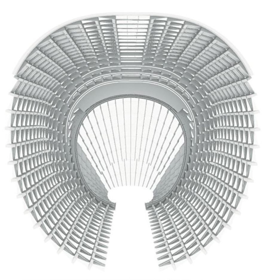 內(nèi)外幕墻均通過(guò)設(shè)計(jì)手法,諸如鋸齒幕墻、蓑衣幕墻等方式,通過(guò)錯(cuò)位和折疊來(lái)消化誤差,提升施工精度同時(shí)也提升了建筑表現(xiàn)力 。