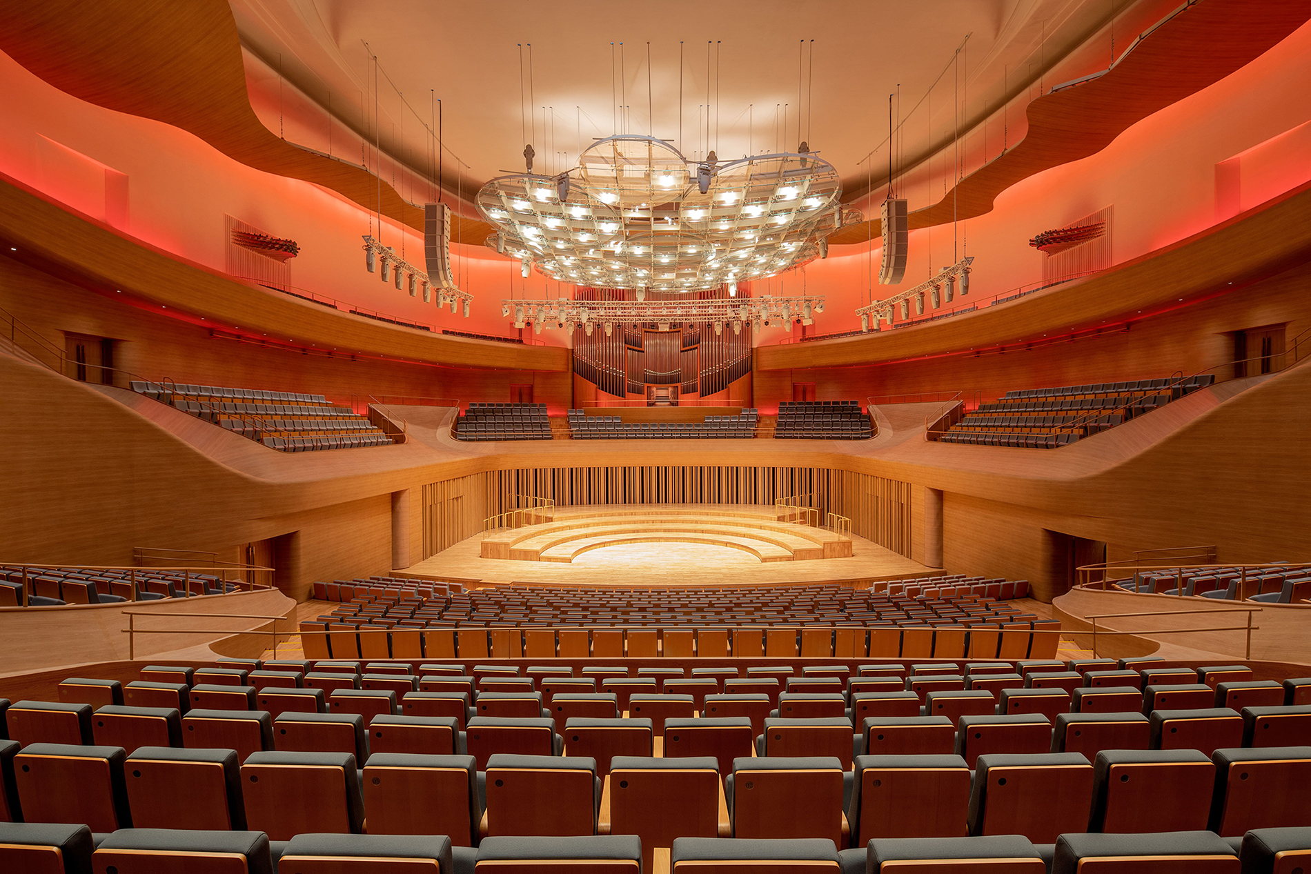 北京藝術(shù)中心以其卓越的技術(shù)創(chuàng)新成為當代劇院設(shè)計的典范。建筑外立面由4300多塊立體折疊鋁板構(gòu)成獨特的金屬折板幕墻系統(tǒng),與高性能玻璃幕墻交織出"徐徐拉開的大幕"的靈動意象,既塑造了鮮明的建筑個性,又通過自遮陽設(shè)計和節(jié)能材料有效降低了建筑能耗。內(nèi)部四個專業(yè)劇場各具特色,其中音樂廳創(chuàng)新性地融合了葡萄園式與鞋盒式布局優(yōu)勢,通過數(shù)字化聲學模擬與1:10縮尺物理模型驗證,確保中頻混響時間精確達到2.2秒的頂級水準,并配備了國際首創(chuàng)的一主兩輔分開布設(shè)的86音栓管風琴。
