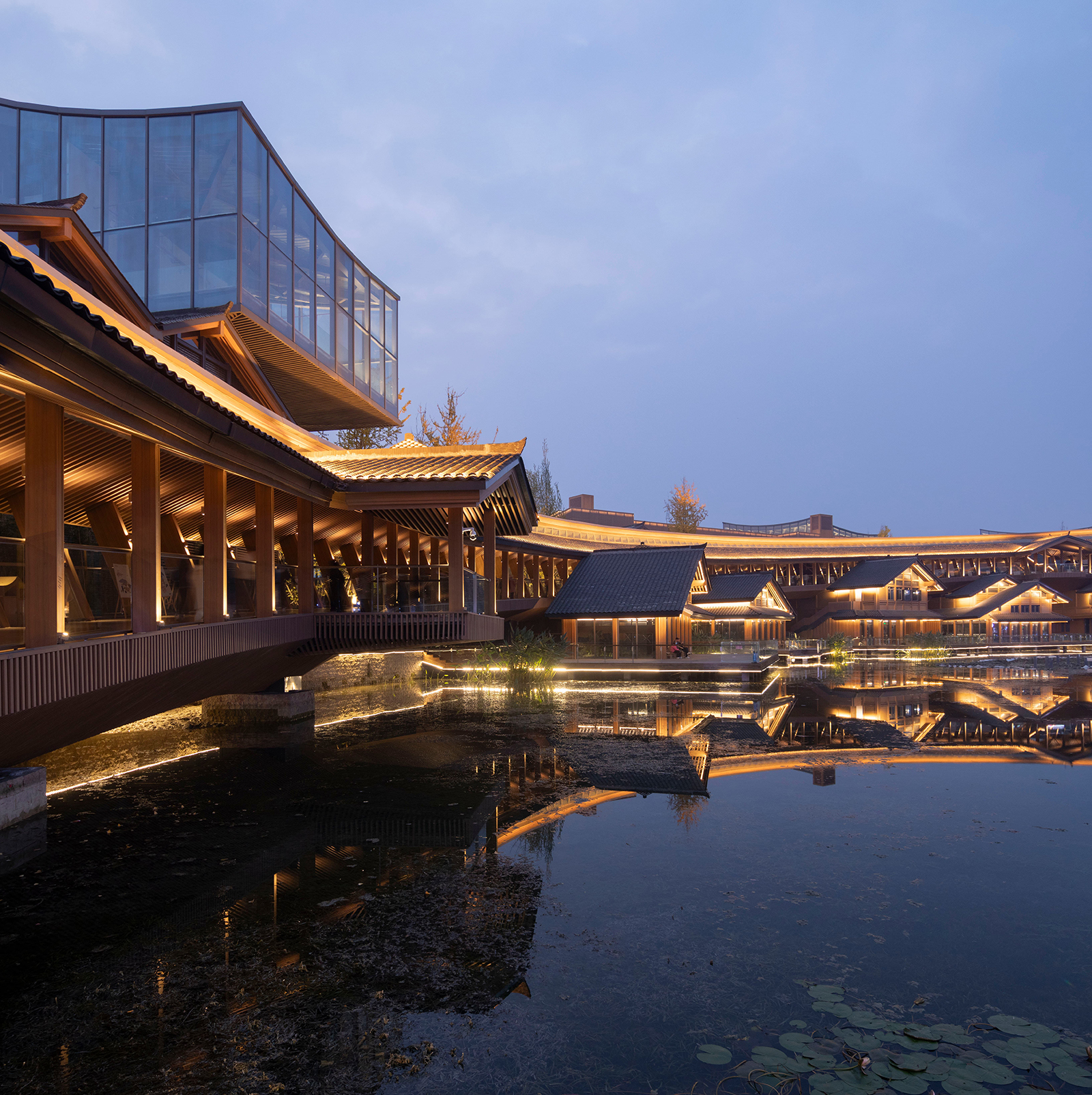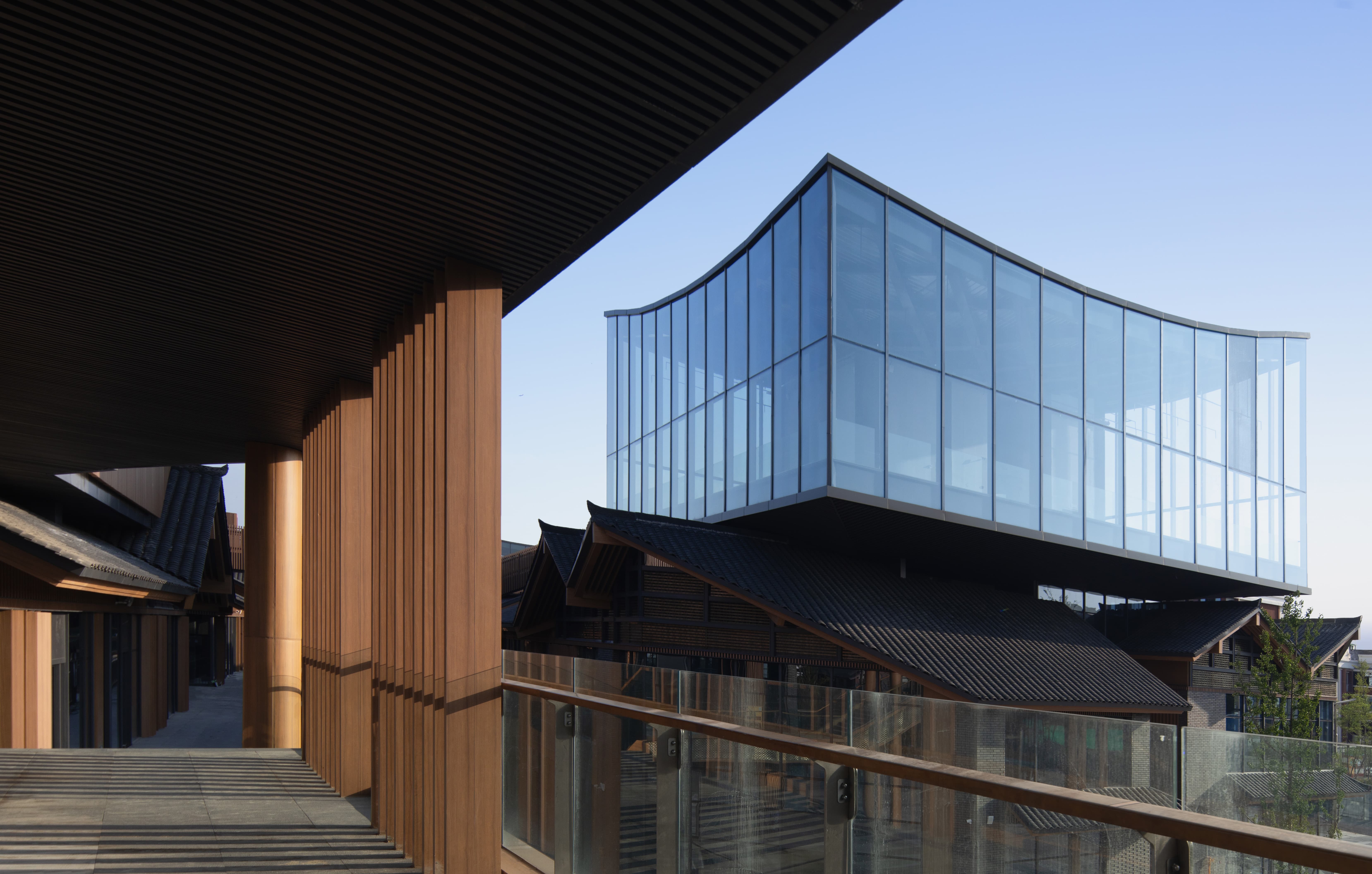 設(shè)計選用了川西特色建筑的構(gòu)造形式及本土材料,與周圍環(huán)境和諧統(tǒng)一。龍興寺項目于2024年面向公眾開放,不僅為彭州塑造了一個有“煙火氣”的超級商業(yè)街區(qū),重構(gòu)了城市新中心,也成為了彭州最具代表性的文化旅游名片。