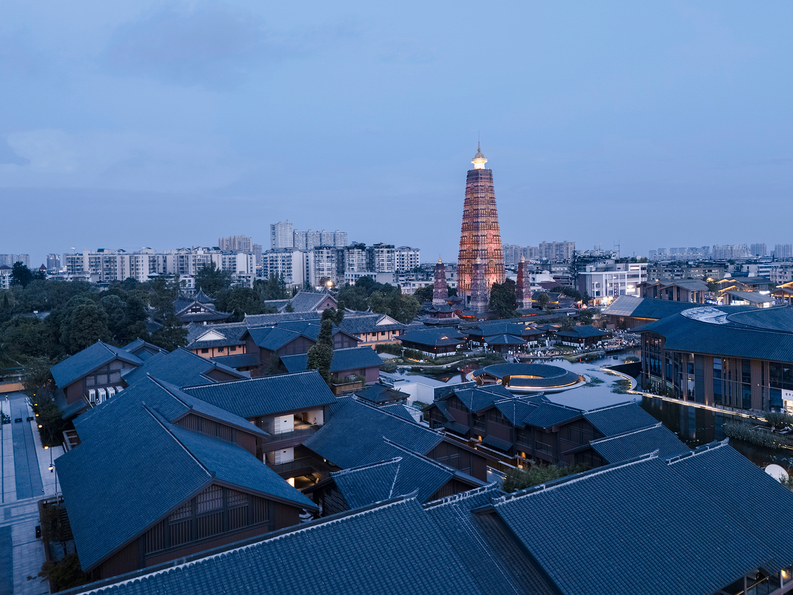 成都彭州龍興寺區(qū)域城市更新項目由北京建院BIAD-ASA筑景工作室設(shè)計,成都彭州龍興寺區(qū)域城市更新項目位于成都彭州市中心城區(qū),因區(qū)域內(nèi)有一座千年古寺——龍興寺而得名,總建筑面積約15萬平方米,功能主要包括商業(yè)、文化、酒店、民宿等。設(shè)計希望通過表現(xiàn)城市的空間意象來還原城市特征:提取中國傳統(tǒng)城市空間中“十方叢林”“坡屋頂”與“天際線”的意象與建筑相結(jié)合,并將重要的步行公共空間與景觀設(shè)計進行立體化融合,從而將現(xiàn)代功能的“大空間”轉(zhuǎn)化為具有傳統(tǒng)形象和宜人尺度的“小空間”,實現(xiàn)“傳統(tǒng)空間的現(xiàn)代表達”。