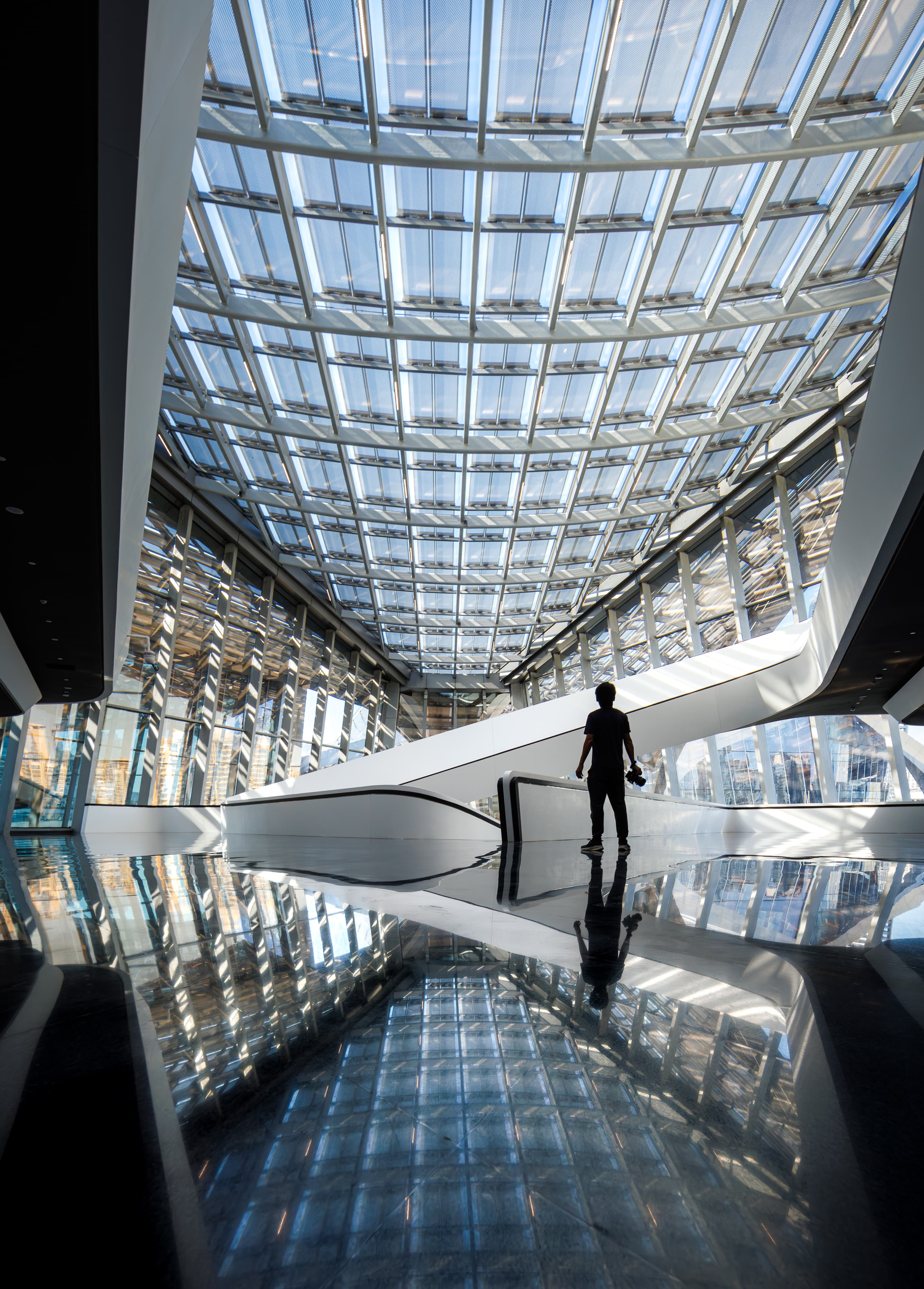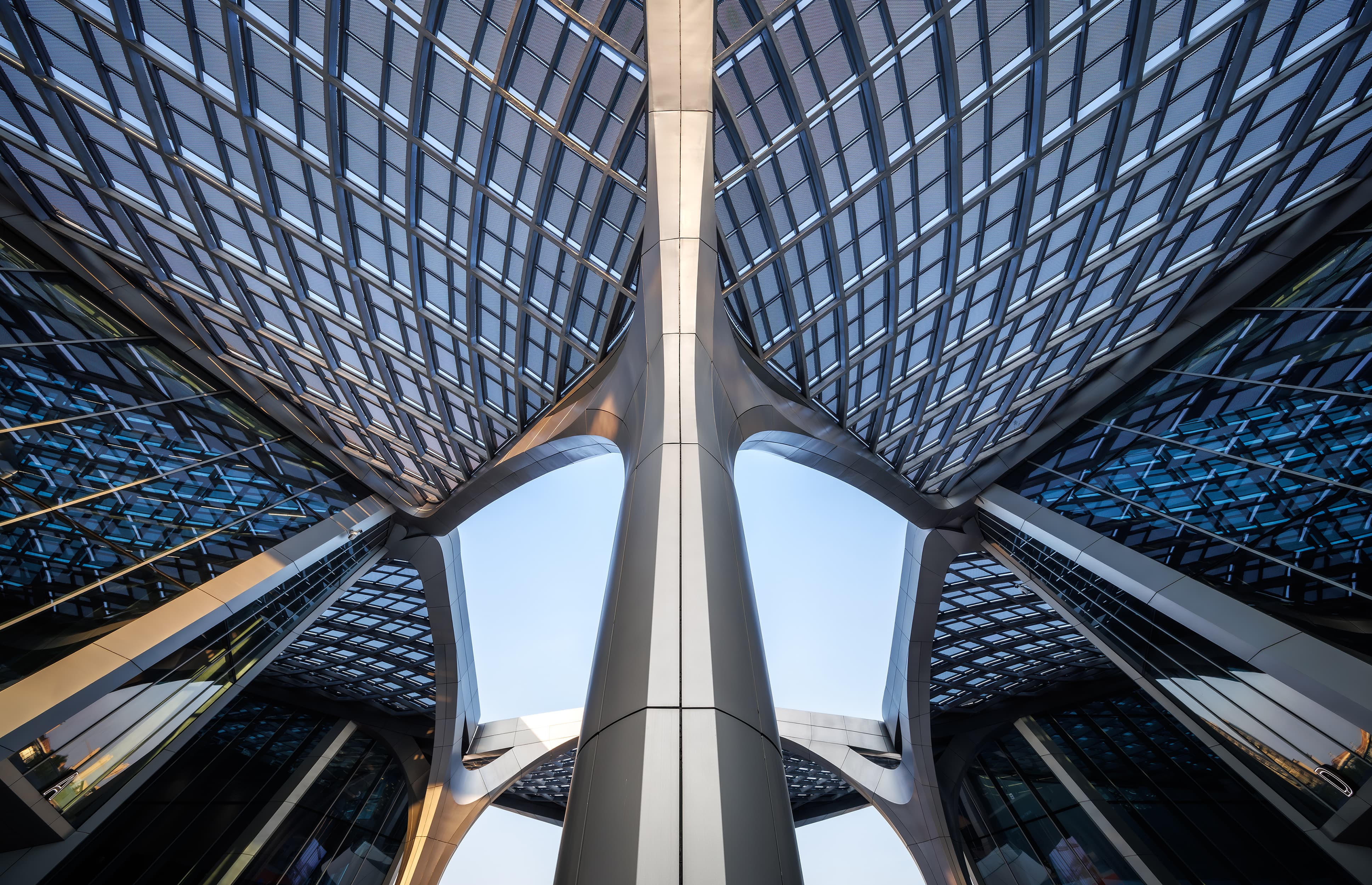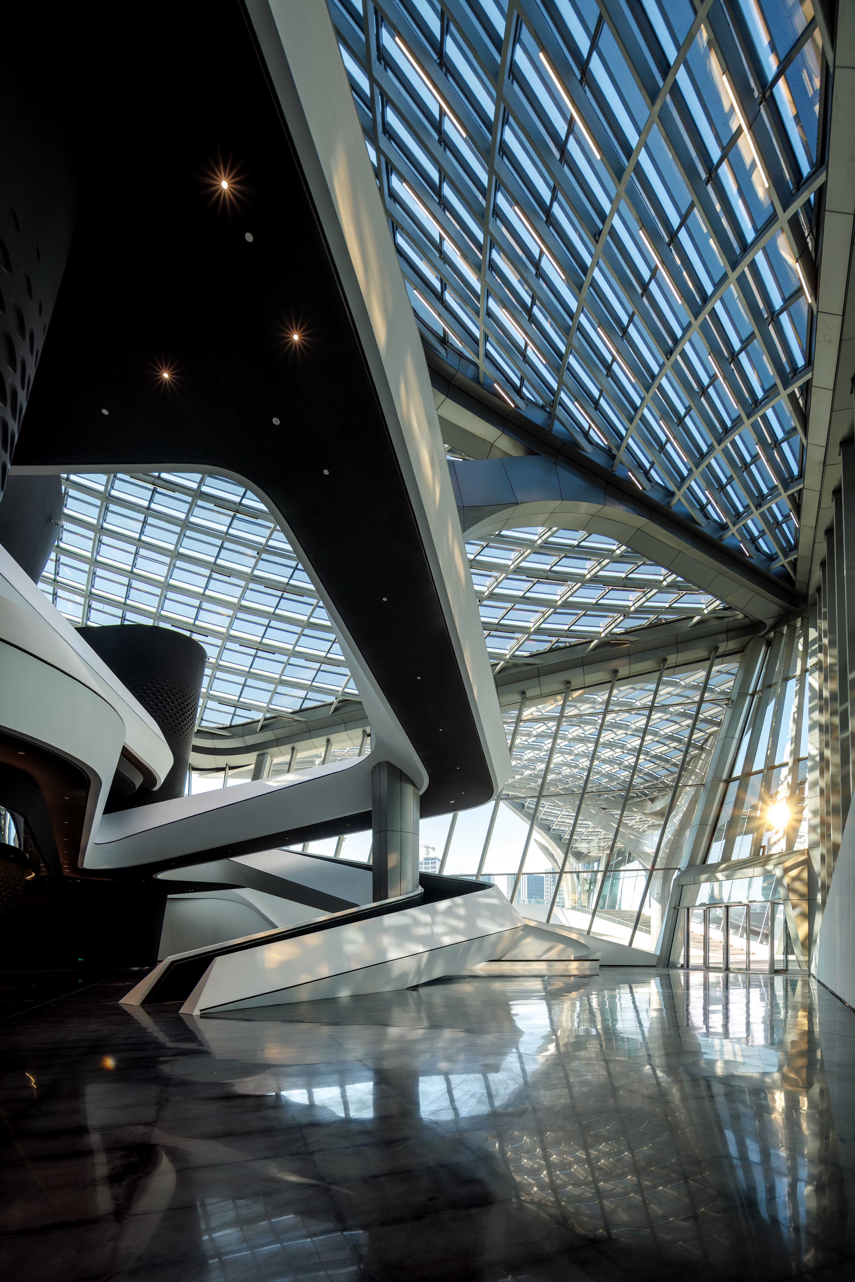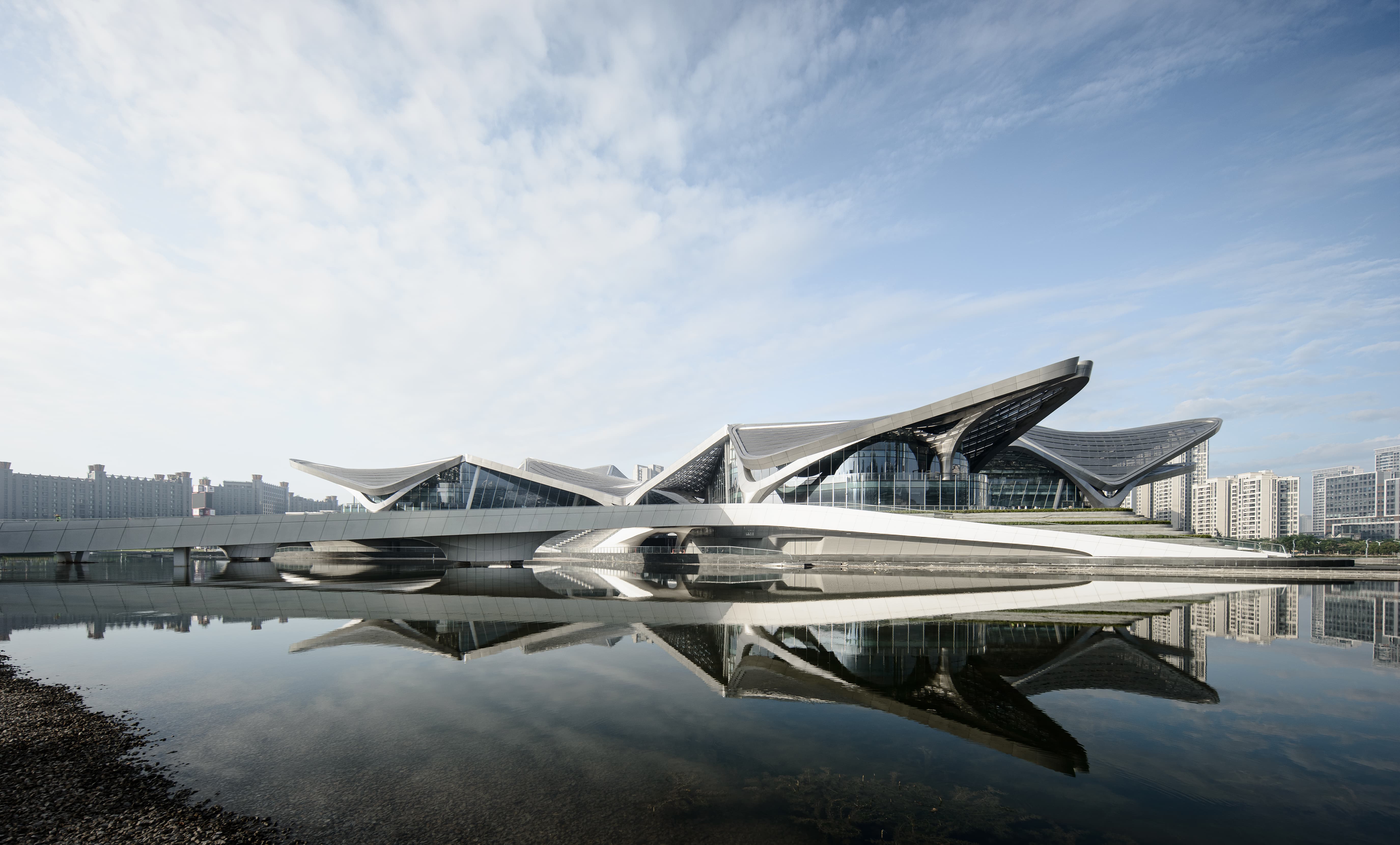 北京建院華南設(shè)計中心與Zaha Hadid Architects 共同完成的金灣航空城市民藝術(shù)中心設(shè)計靈感來源于成群的飛鳥以及漂流的風帆,由此塑造了具有震撼力的建筑輪廓,成為航空城中心中軸線上的新地標。標志性形象主要體現(xiàn)在屋面形態(tài),為了呼應(yīng)候鳥在編隊飛行時的“V”形圖案,每個場館都采用了重復、對稱且尺寸來回變化的曲面網(wǎng)殼為基本造型,形成了一個由相似元素構(gòu)成的組合,四部分錯落關(guān)系屋面的將大劇院、多功能廳、科普交流區(qū)及藝術(shù)展示區(qū)四大功能整合成一體,舒展飄逸、連續(xù)變化的羽翼狀建筑,與中心湖的濱水景觀交相輝映,形成一道靚麗的風景線。