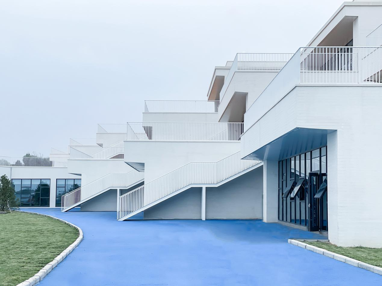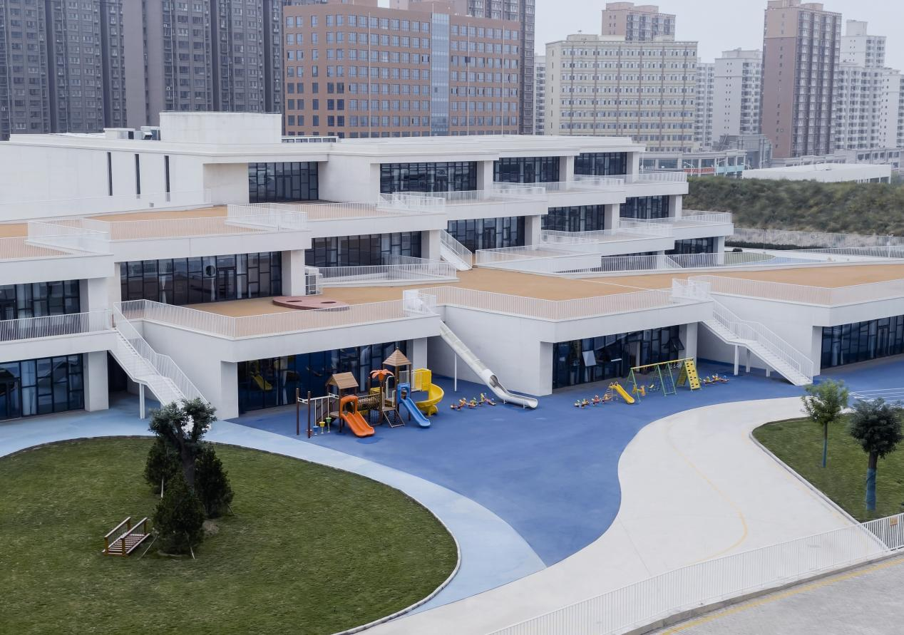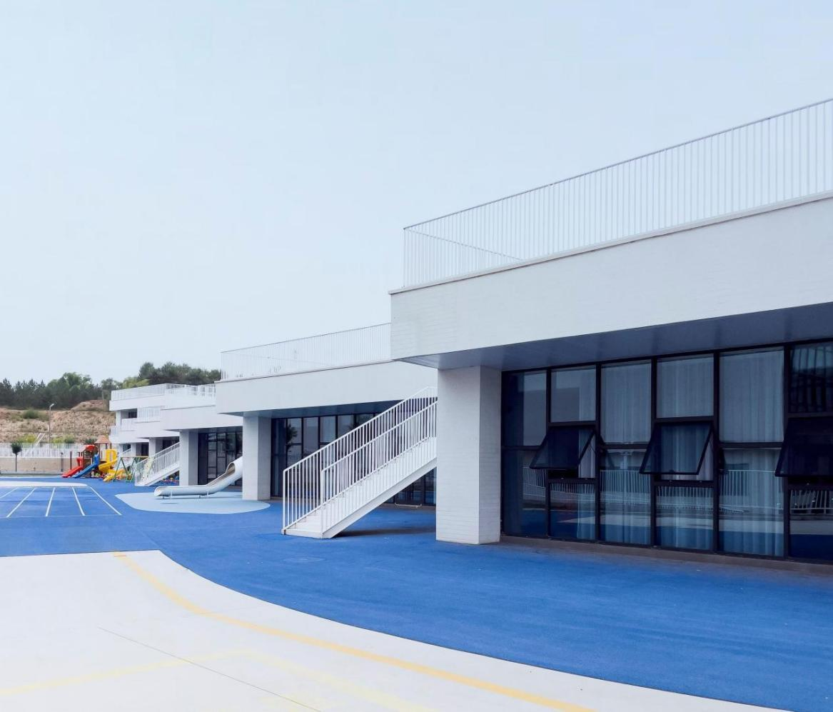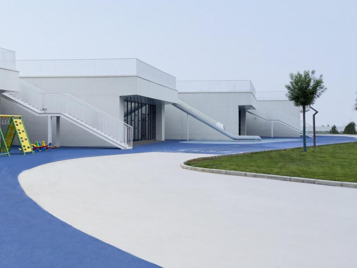 建筑外立面采用白色真石漆作為核心飾面材質(zhì),輔以白色金屬欄桿,形成簡潔統(tǒng)一的建筑風(fēng)格。場地內(nèi)的綠色草坪與藍(lán)色橡膠跑道色彩層次豐富,既注入自然生態(tài)氣息與活動活力,又與建筑外立面形成材質(zhì)、色彩的和諧呼應(yīng)。設(shè)計以兒童行為需求為核心,打造開放通透、安全舒適的學(xué)習(xí)活動場所,孩子們在這里自由玩耍、釋放天性。