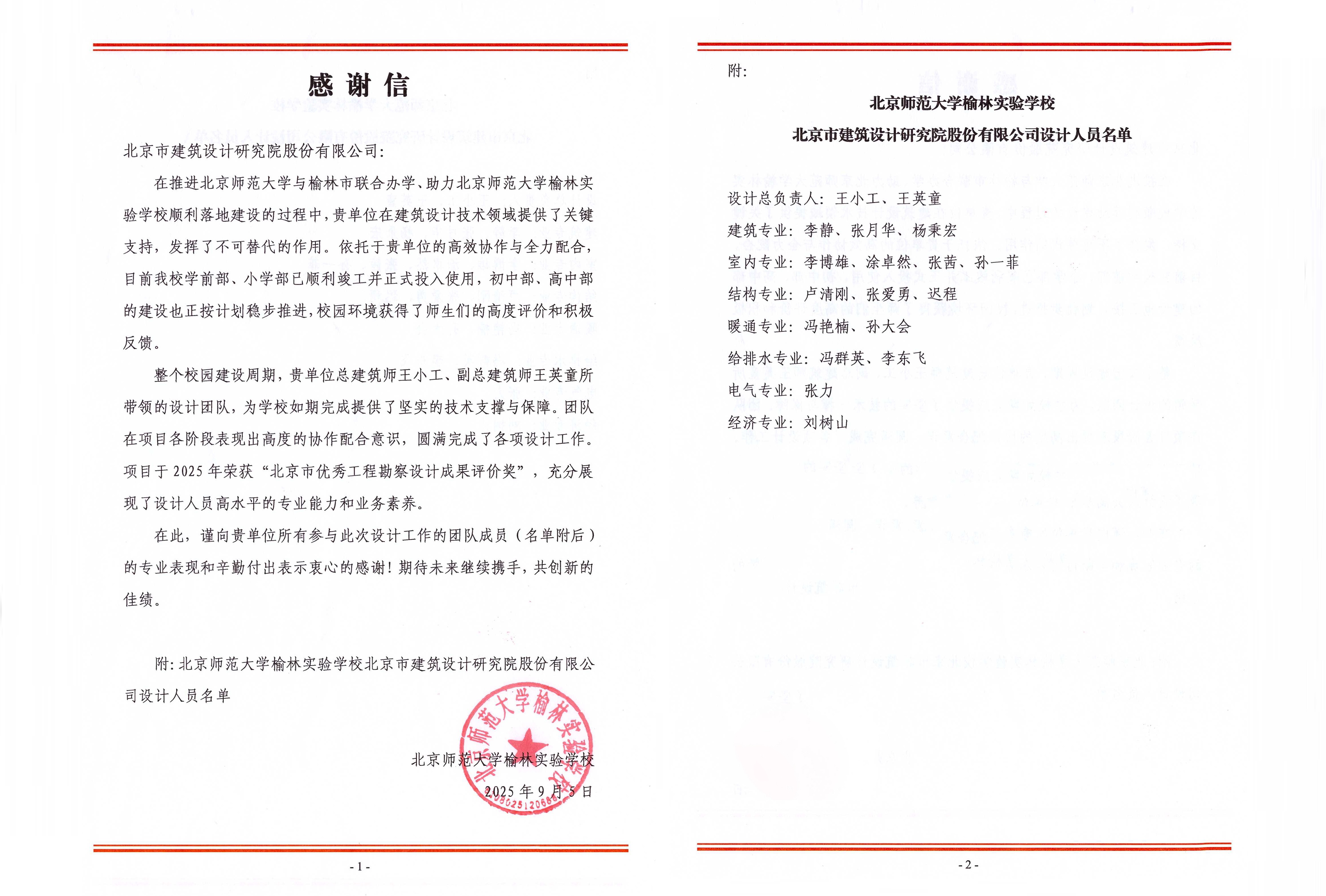 信中對北京建院設(shè)計團(tuán)隊在推進(jìn)北京師范大學(xué)與榆林市聯(lián)合辦學(xué)、助力北京師范大學(xué)榆林實驗學(xué)校順利落地建設(shè)過程中的專業(yè)表現(xiàn)和辛勤付出表示感謝,并向項目榮獲“2025年北京市優(yōu)秀工程勘察設(shè)計成果評價獎”致以祝賀,對設(shè)計人員在整個校園建設(shè)周期,展現(xiàn)出的高水平專業(yè)能力和業(yè)務(wù)素養(yǎng)給予充分認(rèn)可。