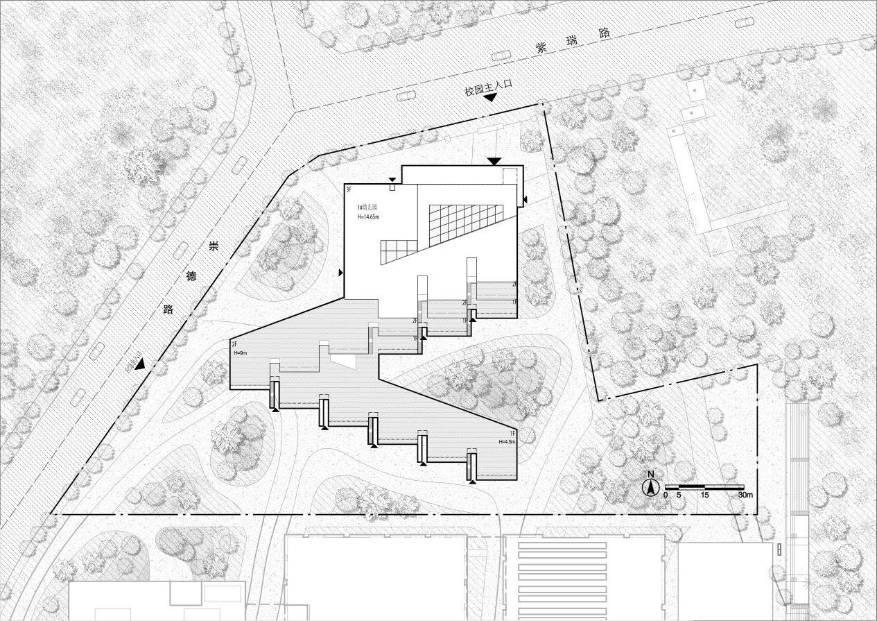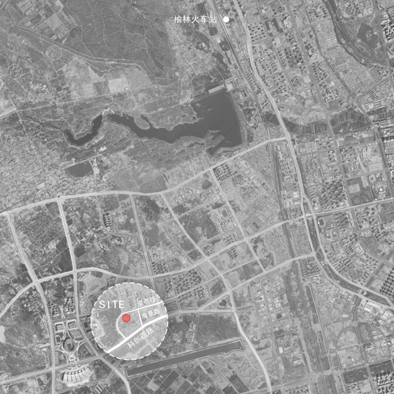 項目位于陜西省榆林市,場地南鄰科創(chuàng)四路,東至居然路,西至規(guī)劃道路,北至紫瑞路。項目用地不規(guī)則,設(shè)計團(tuán)隊最大化地利用場地完成總體布局,主入口設(shè)置在北側(cè)道路上,西側(cè)道路設(shè)置應(yīng)急出入口,南側(cè)緊鄰北京師范大學(xué)榆林學(xué)校小學(xué)部地塊,東南角地形高差較大,考慮到土方平衡,利用場地現(xiàn)有地形高差打造梯田式實踐園地,將園區(qū)綠地景觀與教育理念相結(jié)合,同時也完成幼兒園和小學(xué)的景觀銜接。