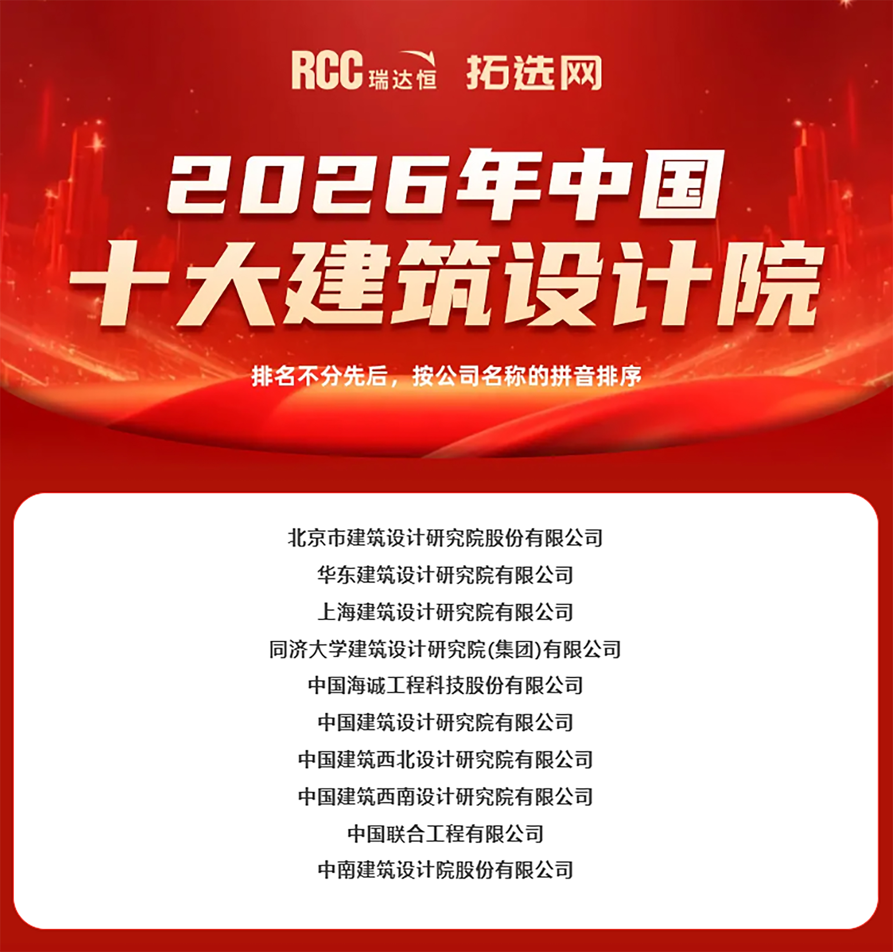 2026年建筑行業(yè)十大建筑設(shè)計(jì)公司榜單權(quán)威發(fā)布,該活動(dòng)由知名建筑行業(yè)咨詢公司RCC瑞達(dá)恒主辦,已連續(xù)舉辦16年。RCC瑞達(dá)恒系統(tǒng)性地監(jiān)測各大新聞媒體、中大型甲方單位、設(shè)計(jì)公司及施工單位網(wǎng)站以及各級(jí)政府的信息平臺(tái),并致電和拜訪了三百多萬家開發(fā)商、政府機(jī)關(guān)、設(shè)計(jì)公司、承建商和分包商的項(xiàng)目負(fù)責(zé)人,調(diào)研范圍覆蓋2025全年、超過42萬個(gè)有效樓宇項(xiàng)目,項(xiàng)目總造價(jià)超過46萬億元。RCC瑞達(dá)恒經(jīng)過系統(tǒng)和人工篩選后全年收錄的工程行業(yè)的招中標(biāo)公告達(dá)3740萬條,其中包括2100萬條中標(biāo)公告。以上述的大數(shù)據(jù)為依托,RCC瑞達(dá)恒測算出各企業(yè)所參與的項(xiàng)目和采購的總價(jià)和規(guī)模,秉承客觀和公正的原則,評(píng)選出“中國十大承建單位、中國十大建筑設(shè)計(jì)公司、中國十大民營、外資、室內(nèi)裝修設(shè)計(jì)公司”。