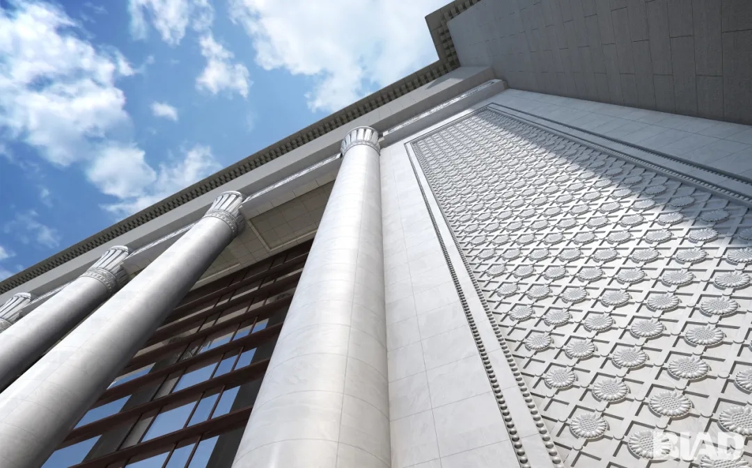 展覽館布局中心對稱,層次分明,空間恢宏大氣。建筑采用傳統(tǒng)柱廊式結(jié)構(gòu),承襲人民大會堂、國家博物館等開國經(jīng)典建筑的文化基因,通過厚重的實墻和挺拔的柱廊承托頂冠,形成簡約、大氣、質(zhì)樸的建筑意向。建筑細節(jié)造型上充分體現(xiàn)中華文化特征,具有一定的歷史傳承性;內(nèi)部結(jié)構(gòu)符合時代對展覽館的功能要求,盡最大可能突出了展覽空間,實現(xiàn)紀念性、傳承性與實用性的有機結(jié)合。