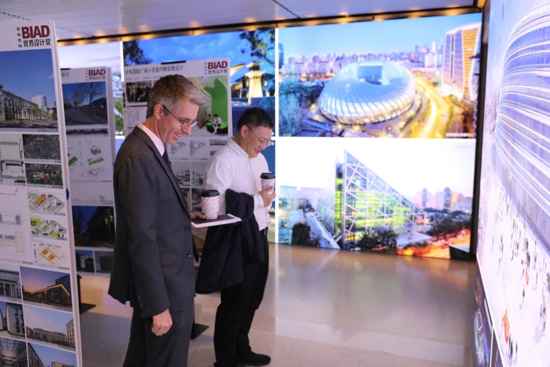 隨后,杜濤一行又來到B座1層展示廳,參觀了北京建院近年來的優(yōu)秀工程,了解了北京建院在建筑規(guī)劃設計、建筑遺址保護和城市更新領域的成就。