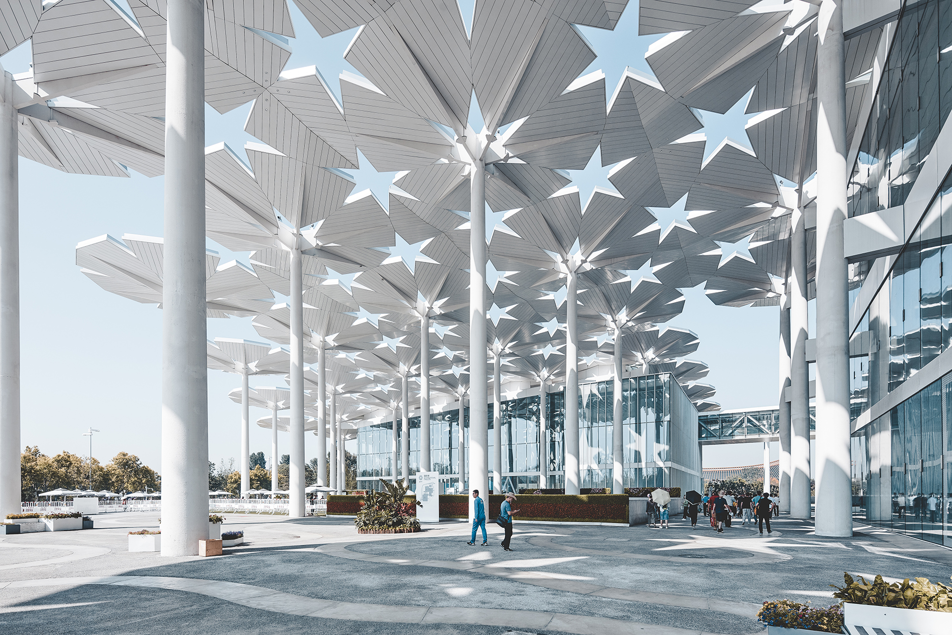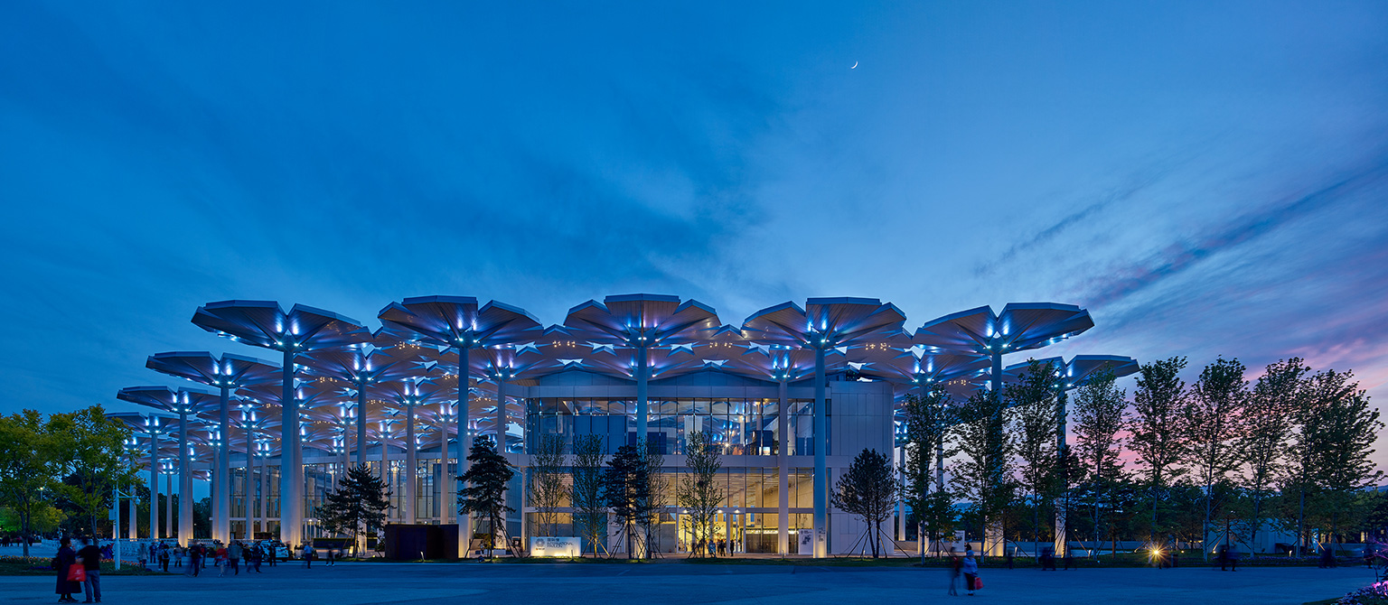 國(guó)際館屋面為輪廓為球面,94朵花傘有94種造型,設(shè)計(jì)通過(guò)縱向壓縮,將每4朵花傘統(tǒng)一為一個(gè)16.8X16.8矩陣網(wǎng)格,實(shí)現(xiàn)了對(duì)復(fù)雜造型的精確幾何控制。漏斗形花傘利于雨水排放和收集利用,花傘上方覆蓋光伏發(fā)電膜,體現(xiàn)綠色設(shè)計(jì)理念,花傘絢麗的夜景照明效果為2019北京世園會(huì)提供了最經(jīng)典的記憶。