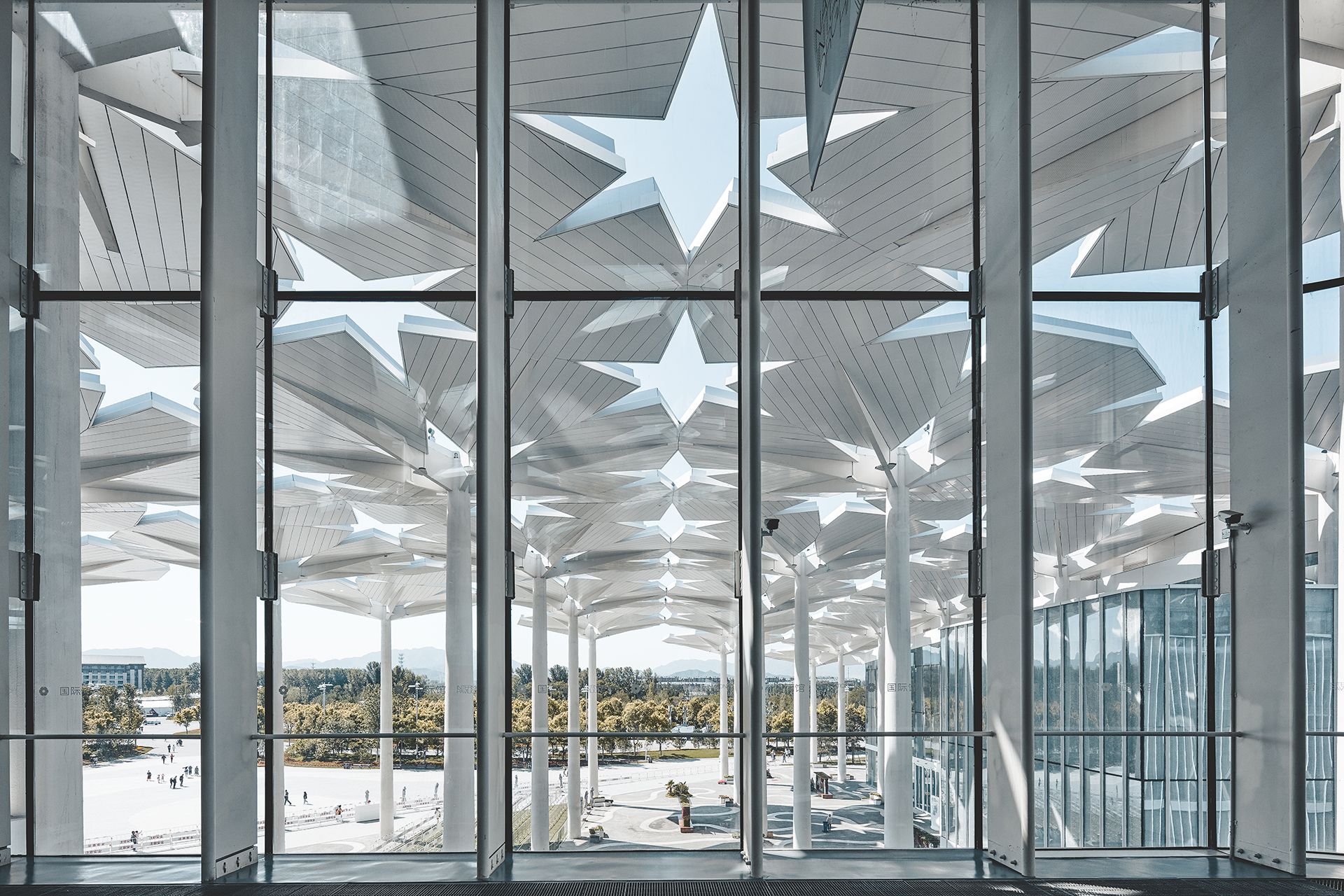 創(chuàng)新采用異型鋼框架結(jié)構(gòu)體系,實(shí)現(xiàn)建筑“花?!崩砟睢N菝?4朵“花傘”組成的“花?!?,是本項(xiàng)目最矚目的造型特點(diǎn)。結(jié)構(gòu)設(shè)計(jì)充分利用建筑“花傘”造型和找形“花瓣”的幾何邏輯,“編織”既符合建筑外觀造型又滿足結(jié)構(gòu)受力需要的異形鋼框架。通過(guò)對(duì)異形鋼框架單元和整體結(jié)構(gòu)的深入分析,證明結(jié)構(gòu)具有較好的受力特性:屋蓋平面內(nèi)剛度較大,可協(xié)調(diào)南北展廳變形和受力,結(jié)構(gòu)抗側(cè)剛度和整體性較強(qiáng);折形屋蓋通過(guò)豎向變形釋放溫度內(nèi)力,實(shí)現(xiàn)超長(zhǎng)結(jié)構(gòu)不設(shè)縫。