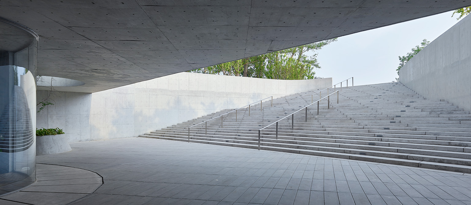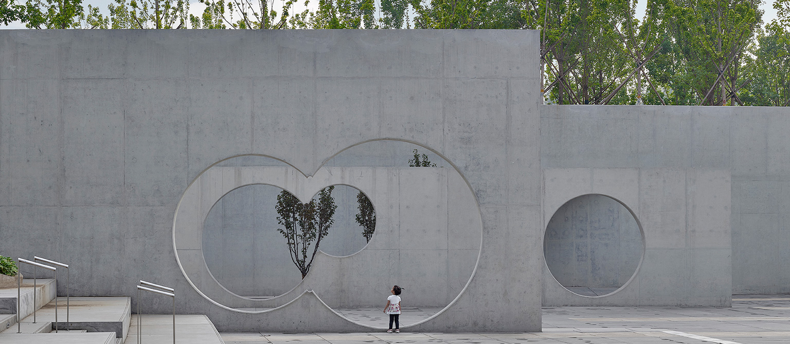 由于建筑位于公園內(nèi)部,方案以現(xiàn)代建筑語言結(jié)和傳統(tǒng)中國園林意境,通過下沉手法將建筑主體“隱”于公園景觀綠植當(dāng)中,為平面化的傳統(tǒng)公園創(chuàng)造出多層次、豐富的空間體驗。通過簡單、明確的幾何關(guān)系將建筑主體、植栽池、小品、鋪裝等有機(jī)統(tǒng)一,局部覆土建筑和通透的玻璃立面模糊了室內(nèi)與室外,建筑與景觀的關(guān)系。