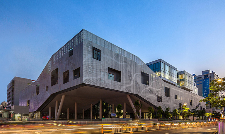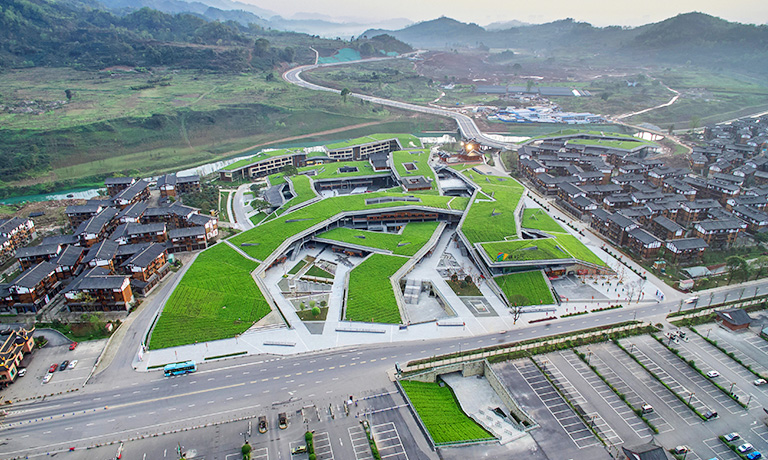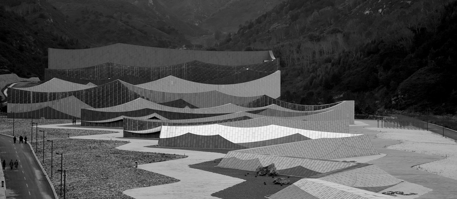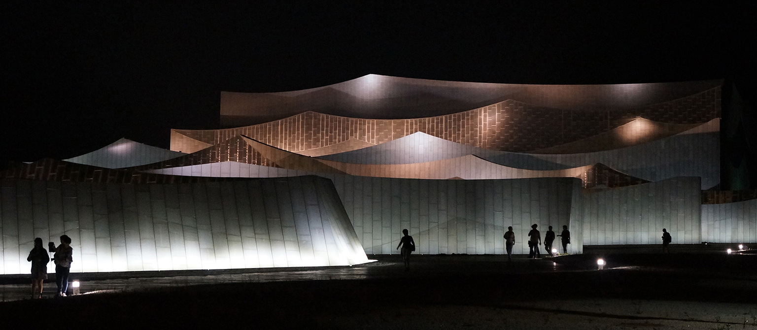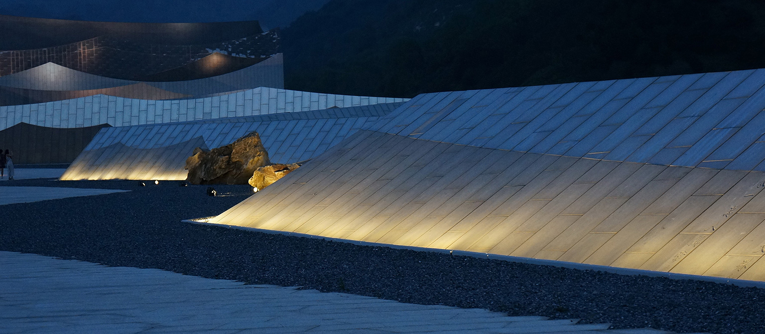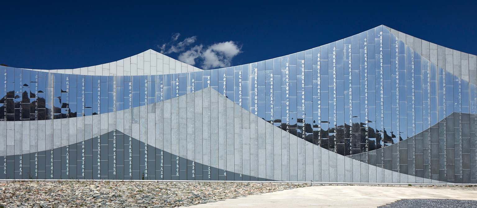 她以約700米長、徐徐展開的“經(jīng)折”置于劇場之前,由高到低排列形成漸開的序列,成為劇場表演前奏的序曲,承載著讓游人平復情緒、感知所在的功能。而劇場就成為了還沒有、或正在被打開一本博大的經(jīng)書,預示蘊藏著知識和智慧的寶庫。在接近景區(qū)道路的一端,“經(jīng)折”以高反光的不銹鋼頂面直接插入碎石的地面,突出了“經(jīng)折”構造的力度和純度,對日空和月夜的映照成為最先映入觀眾眼簾的形象。