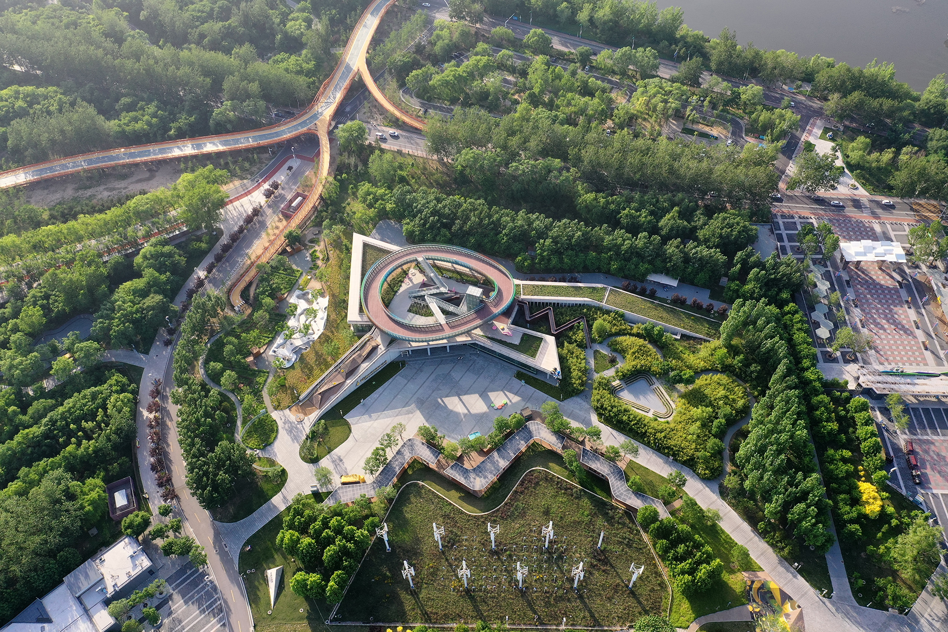 低碳生活館的覆土草坡弱化了建筑的體量,使之宛如從地面生長出來,與周邊環(huán)境更好結(jié)合。建筑一層總體分為4 個部分,參觀游客由南側(cè)主入口進入大廳,公共區(qū)域依次串聯(lián)了展廳、休息廳及后勤輔助空間。展廳內(nèi)部以“自然警示、取之有道、用之有度、南湖變遷、低碳唐山”為展陳主線。