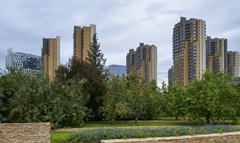 利用立面的風(fēng)格變化,將整個(gè)園區(qū)分為三種組團(tuán)類型。 中心綠地廣場(chǎng)采用中國(guó)傳統(tǒng)的冰嬉圖意向,在院落的核心空間打造適應(yīng)多種運(yùn)動(dòng)的共享空間。每個(gè)地塊的東西兩側(cè)建筑首層及二層局部架空,將城市空間引入本項(xiàng)目的公共空間,形成線性開放空間,為城市退讓出一片活力共享空間。建筑形體做了圓角處理,改善了方正形體帶來(lái)的拘謹(jǐn),更加自由靈動(dòng),對(duì)城市空間更友好。立面多采用淺色石材、深灰色金屬以及具有紋路的彩釉玻璃等材質(zhì)形成雅致的黑白灰色調(diào),凸顯出中國(guó)傳統(tǒng)的書畫意境。屋頂為開放公共空間,通過種植景觀豐富活動(dòng)空間,改善局部氣候,為城市提供綠色生態(tài)的第五立面,同時(shí)屋頂設(shè)置太陽(yáng)能板實(shí)現(xiàn)清潔能源的利用。本項(xiàng)目戶型規(guī)整,南北通透,動(dòng)靜分區(qū),功能齊備。獨(dú)立電梯入戶,增強(qiáng)儀式感。通過裝配式鋼結(jié)構(gòu)實(shí)現(xiàn)戶內(nèi)無(wú)柱或少柱的靈活空間。增設(shè)無(wú)障礙設(shè)施的條件預(yù)留,打造全齡化住宅。以“社區(qū)健康化”為設(shè)計(jì)理念,以人的全周期需求為導(dǎo)向,依托大數(shù)據(jù),打造可進(jìn)化、有感知的、交互式開放智慧社區(qū)。