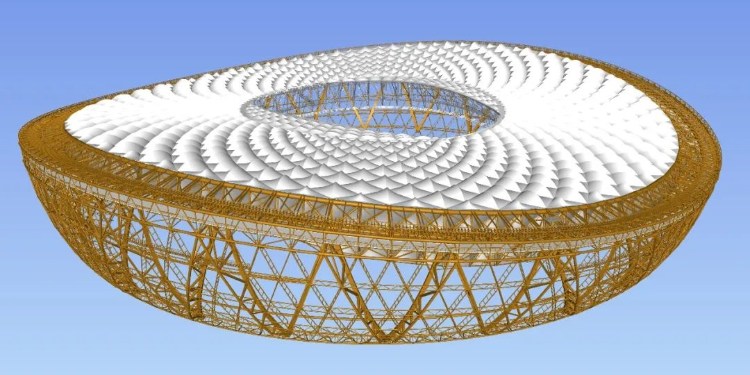 從功能性看,體育場(chǎng)環(huán)梁的頂點(diǎn)標(biāo)高和屋頂懸挑尺寸分別達(dá)到76.6米和95.9米,場(chǎng)內(nèi)固定座席數(shù)多達(dá)92500。體育場(chǎng)壯觀絢麗的建筑效果給人們帶來視覺上的享受,高標(biāo)準(zhǔn)的建筑功能則保障著世界杯閉幕式和包含決賽、半決賽在內(nèi)的10場(chǎng)比賽的順利舉辦。這也給結(jié)構(gòu)設(shè)計(jì)帶來巨大挑戰(zhàn)。