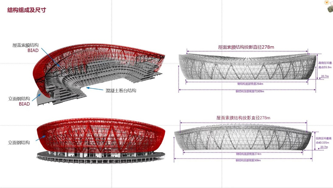 從外觀上看,這個(gè)跨度達(dá)278米的體育場(chǎng)的大跨度馬鞍形屋頂,采用了由主索桁架、次索系和膜結(jié)構(gòu)等組成的高效索膜結(jié)構(gòu)體系,并且尺度巨大,被我國空間結(jié)構(gòu)泰斗、中國工程院院士、浙江大學(xué)董石麟教授稱為“世界上最復(fù)雜的索膜結(jié)構(gòu)體系”。