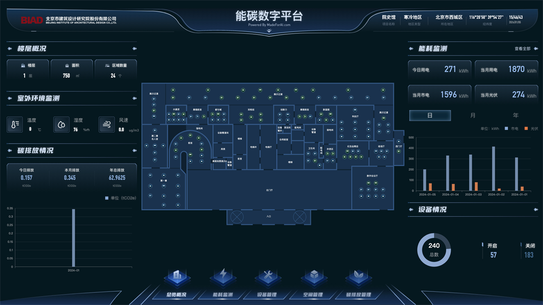 院史館作為低能耗示范項目,通過基于能碳數(shù)字平臺的綠色低碳技術集成,實現(xiàn)建筑節(jié)能降碳目標。能碳數(shù)字平臺是建立在自學習型AI感知技術與建筑CAE仿真技術基礎上的數(shù)字化綜合管理平臺,它可對院史館的能耗、碳排放、可再生能源利用、健康指標等數(shù)據(jù)進行采集、分析、診斷;可對建筑各系統(tǒng)、設備進行AI智能調控,持續(xù)優(yōu)化運行策略,從而達到大幅降低無謂能耗浪費、減少碳排放、提升空氣品質、滿足熱舒適度要求等目的。北京建院能碳數(shù)字平臺已作為2023年北京市國有企業(yè)產(chǎn)業(yè)前沿科技應用場景正式發(fā)布,未來將積極助力園區(qū)與建筑實現(xiàn)綠色低碳、健康舒適、智慧便捷、安全耐久等高質量建設要求。