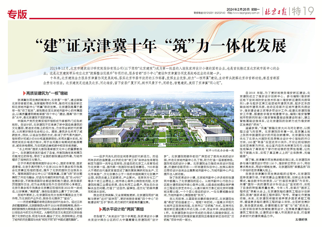 在服務(wù)京津冀協(xié)同發(fā)展戰(zhàn)略的過程中,北京建院堅(jiān)持黨建引領(lǐng),不斷完善企業(yè)管理機(jī)制,創(chuàng)新業(yè)務(wù)發(fā)展模式,輸出數(shù)字科技服務(wù),以“打造百年建院”為目標(biāo),向著“國際一流的建筑設(shè)計科創(chuàng)企業(yè)”堅(jiān)定前行,實(shí)現(xiàn)了自身的轉(zhuǎn)型高質(zhì)量發(fā)展。今年1月,在首次“國家工程師獎”表彰大會上,北京建院超級建筑工程設(shè)計創(chuàng)新團(tuán)隊(duì)獲得“國家卓越工程師團(tuán)隊(duì)”稱號。榮譽(yù)化作更強(qiáng)動能,未來,北京建院將錨定培養(yǎng)更多國家卓越工程師、塑造更多超級建筑工程的奮斗目標(biāo),立足新發(fā)展階段,服務(wù)國家戰(zhàn)略,妥善把握北京“都”與“城”的關(guān)系,以數(shù)字和創(chuàng)新科技賦能建筑設(shè)計,支持高質(zhì)量的超級建筑工程實(shí)施,讓建筑設(shè)計融入市民美好生活,打造更多新時代的建筑精品力作。