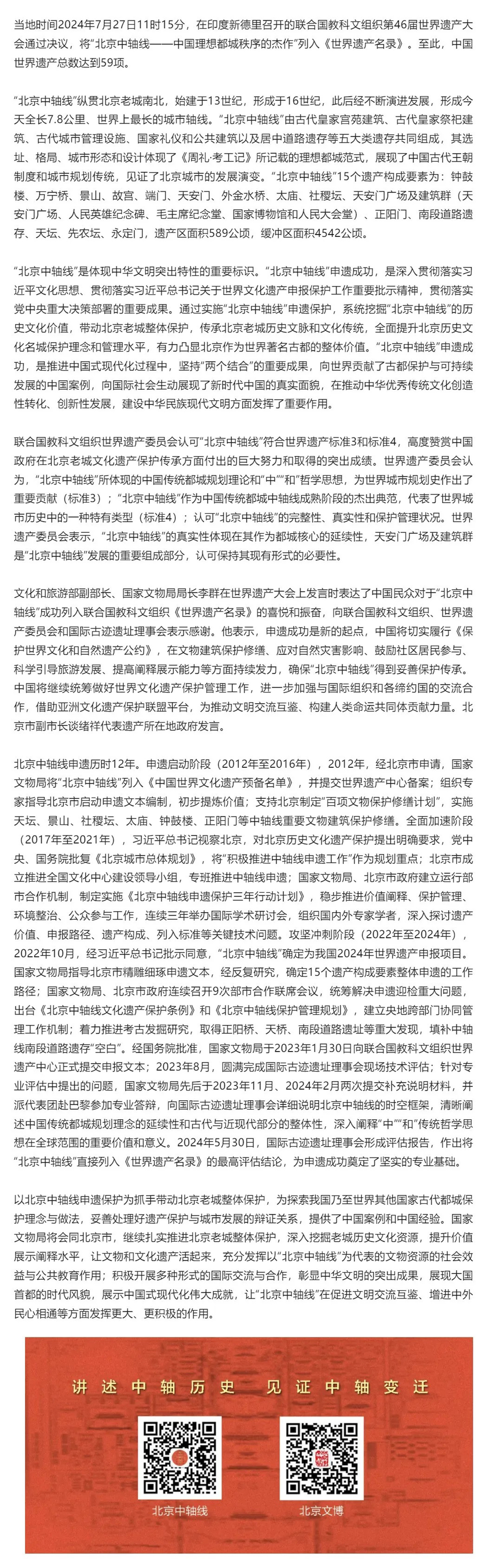 當(dāng)?shù)貢r間2024年7月27日,在印度新德里召開的聯(lián)合國教科文組織第46屆世界遺產(chǎn)大會通過決議,將“北京中軸線——中國理想都城秩序的杰作”列入《世界遺產(chǎn)名錄》。