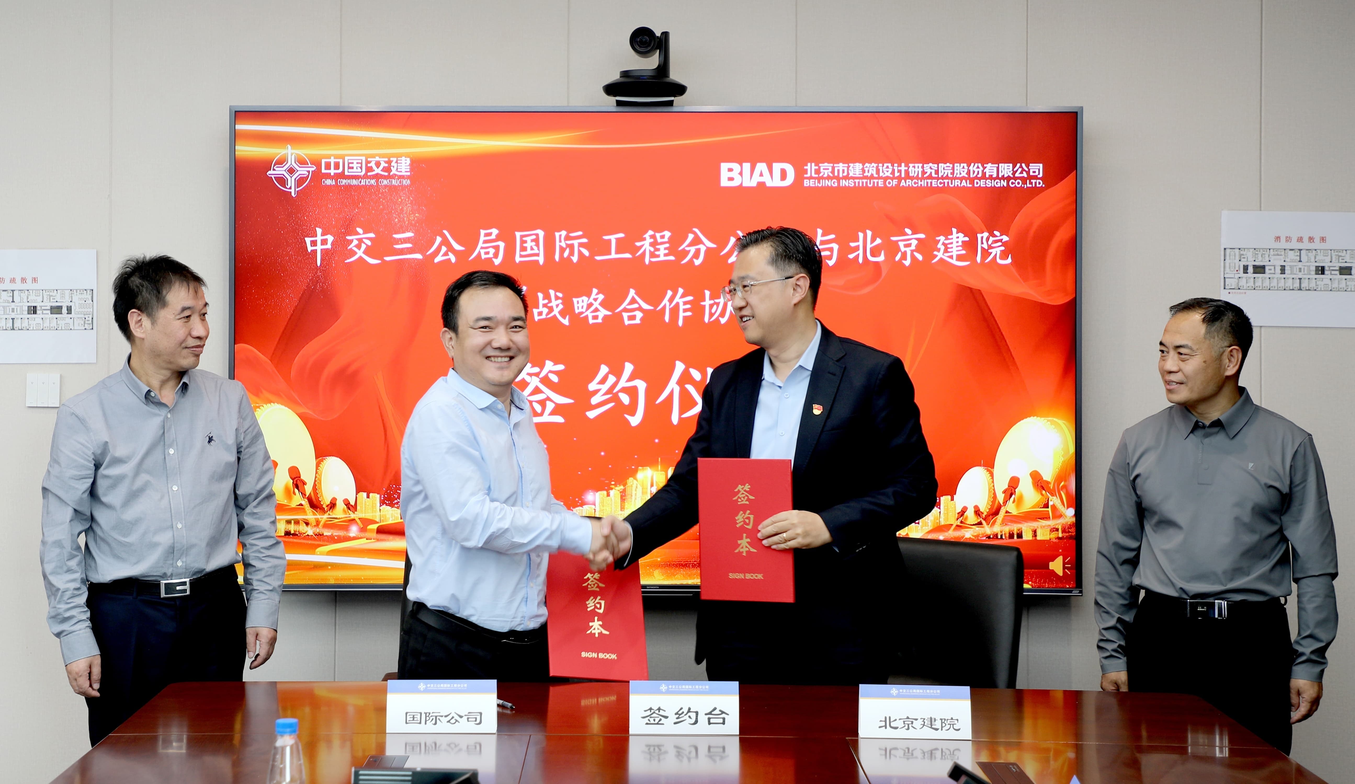 2024年10月15日,北京市建筑設(shè)計(jì)研究院股份有限公司與中交第三公路工程局有限公司國(guó)際工程分公司簽署戰(zhàn)略合作協(xié)議。北京建院副總經(jīng)理王樸軍,建筑與環(huán)藝設(shè)計(jì)院黨支部書(shū)記、院長(zhǎng)李大鵬;中交三公局國(guó)際工程分公司黨委副書(shū)記、總經(jīng)理孫亞鵬,副總經(jīng)理王純海,總工程師高曉宇參加座談和簽約儀式。