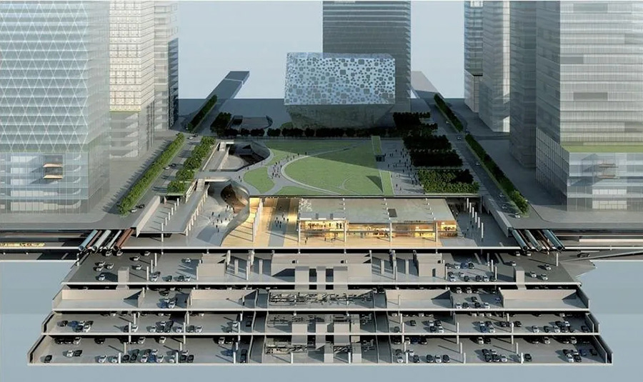 CBD核心區(qū)基礎(chǔ)設(shè)施工程位于中央公共綠地以及道路下方,是集交通、市政、景觀以及綜合防災(zāi)功能為一體的綜合設(shè)施,項(xiàng)目完工后將為區(qū)域提供宜人的地上空間、便捷的交通網(wǎng)絡(luò)和安全高效的市政基礎(chǔ)設(shè)施。本項(xiàng)目是特大型地下綜合工程,在設(shè)計(jì)中著重對(duì)道路空間的綜合開發(fā)與利用進(jìn)行了探討,道路結(jié)構(gòu)的設(shè)計(jì)打破了以往建筑和市政專業(yè)相互分裂的局面,全面整合了城市空間,具有很強(qiáng)的示范意義。