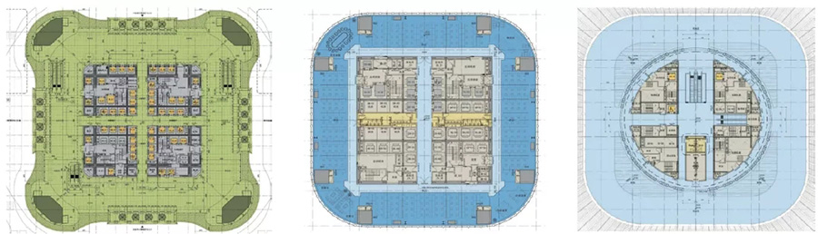 中信大廈的設(shè)計(jì)將現(xiàn)代科技與傳統(tǒng)文化相結(jié)合, 從中國(guó)傳統(tǒng)禮器“尊”的形體特征中汲取造型的靈感, 經(jīng)過(guò)抽象處理和比例優(yōu)化,形成高雅秀美的獨(dú)特造型。建筑方正舒朗、莊重恢弘,底部穩(wěn)重大氣,與結(jié)構(gòu)要求相得益彰, 從底向上逐漸收分, 提供合理舒適的辦公空間,頂部逐漸放大形成雙曲線造型。曲線的建筑造型不僅打破了常規(guī)高層建筑直線形態(tài), 建筑圓潤(rùn)精巧的造型也有效減少了風(fēng)荷載對(duì)超高層建筑的影響。