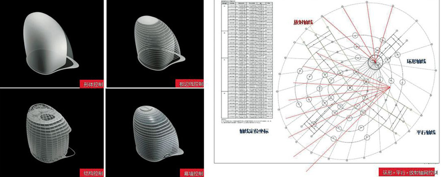 復(fù)雜建筑的關(guān)鍵在于三維幾何控制,通過(guò)邏輯清晰可描述的體系來(lái)進(jìn)行定義形體、板邊線、結(jié)構(gòu)柱軸線、幕墻基礎(chǔ)定位線等。本項(xiàng)目利用放射軸面和弧形平行軸面的組合軸網(wǎng)進(jìn)行整體控制,前者控制幕墻及外圍幕墻柱的形式一致,后者控制核心筒及功能平面,兩者相對(duì)獨(dú)立又相互關(guān)聯(lián),所有幾何元素都在軸網(wǎng)和控制體的基礎(chǔ)上通過(guò)計(jì)算得到。