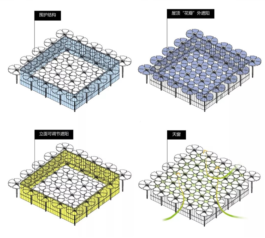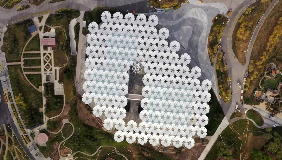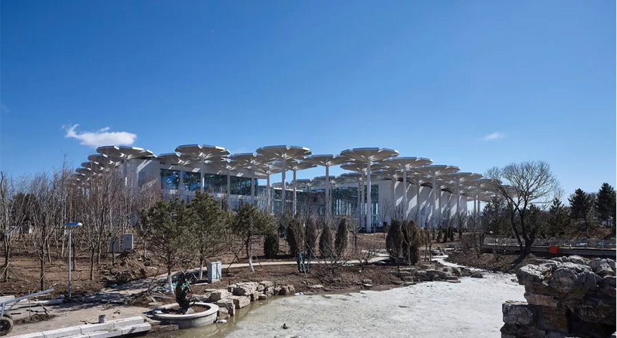 此外,設計團隊還為94把“花傘”賦予了綠色、科技、智慧的功能。比如,在“花傘”頂部鋪設了光伏膜,可以在白天通過太陽能蓄電,為建筑的夜間運行提供輔助供電;針對延慶地區(qū)冬季寒冷多降雪、易結冰的氣候特點,每把“花傘”的頂部設有融雪電纜;在花傘頂部設置了坡向圓心,并在花傘柱內設置雨水管,使雨水得以回收利用。