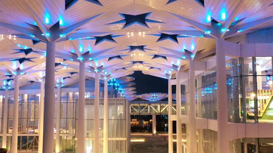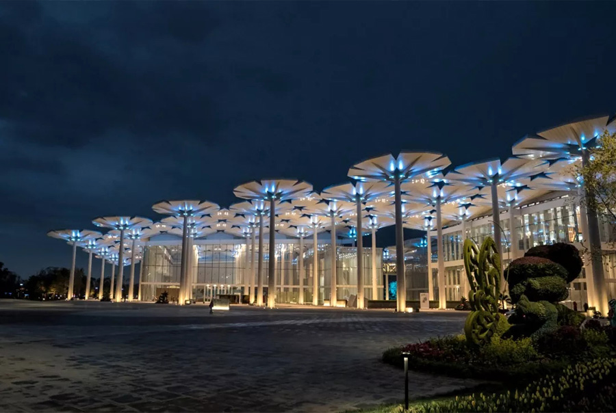 就像人在白天的工作和晚上的生活中會有不同,設計團隊希望國際館也有兩面,白天是冷靜典雅的一面,晚上是狂熱奪目的一面。為此,設計團隊在94朵“花傘”上,設置了約1000盞LED燈具,可以按照花朵、色塊和變化時長,進行不同維度的分組、組合,從而在晚上呈現(xiàn)出五彩繽紛的燈光效果。這種大膽的燈光設計方式,在世園會的展館中尚數(shù)首次。