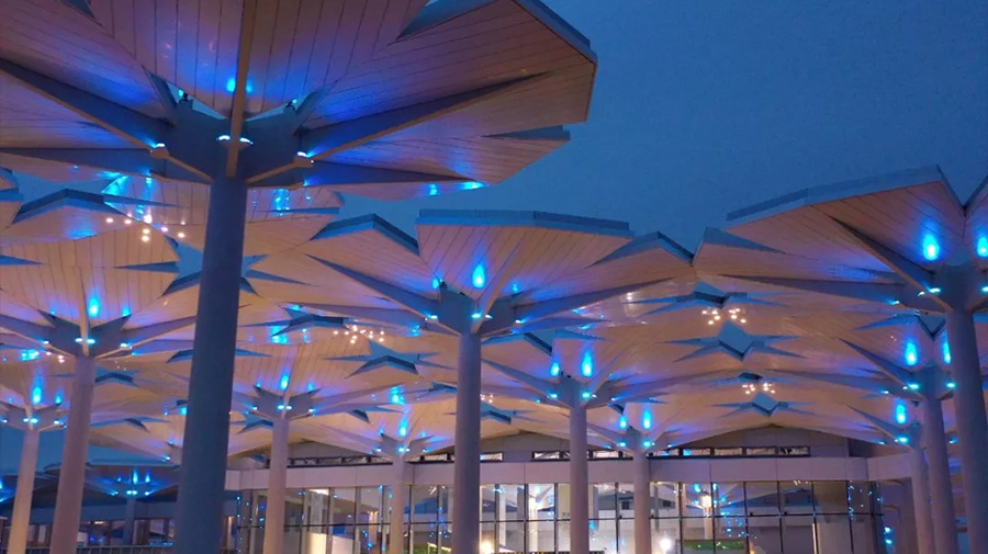 國際館館頂簇擁著的“花傘”是這次設計的最大亮點,由鋼柱和懸挑鋼梁構成的“花傘”,在頂部的花瓣處互相連接,既對建筑起到支撐作用,又構成了如同“花?!卑愕奈蓓?。