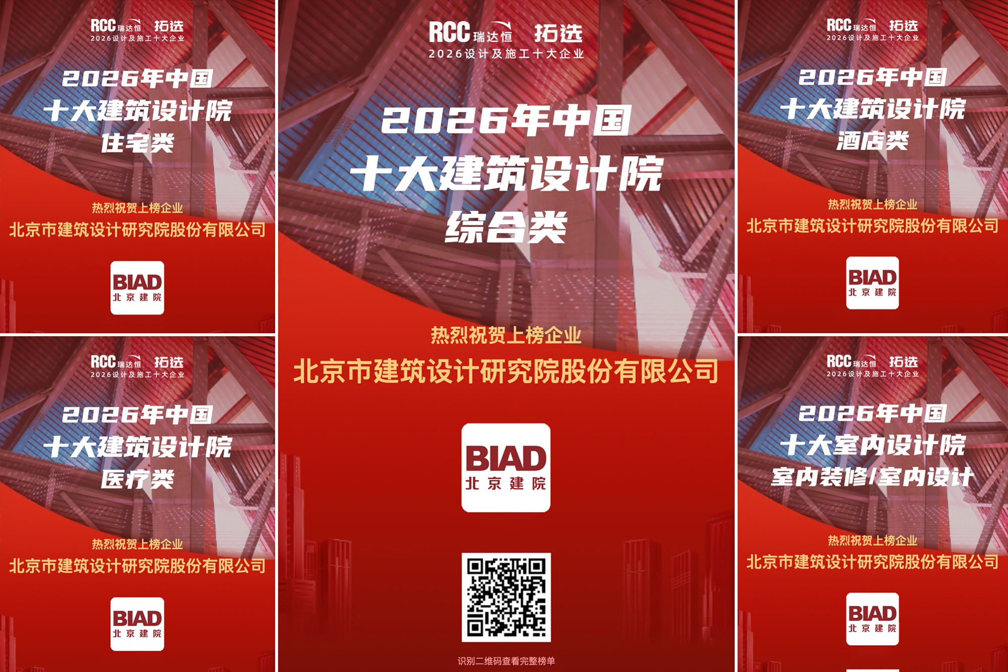 日前,2026年“中國建筑行業(yè)十大系列評(píng)選”榜單權(quán)威發(fā)布。北京市建筑設(shè)計(jì)研究院股份有限公司榮登“2026中國十大建筑設(shè)計(jì)公司”綜合類榜單,同時(shí)入選四大類別細(xì)分領(lǐng)域榜單(酒店類、醫(yī)療類、住宅類、室內(nèi)裝修/室內(nèi)設(shè)計(jì))。