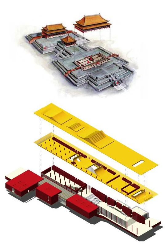 軸線的設(shè)計靈感來自于哪兒?張宇告訴記者,故宮博物院北院區(qū)所在之處,可建設(shè)用地地塊狹長、形狀不規(guī)則,東西長約900米,而南北最窄處僅60米。在狹長的地形里如何滿足一座現(xiàn)代化博物館的功能?設(shè)計團隊反復(fù)考量后發(fā)現(xiàn),如果是在西南側(cè)布置主要展覽的話,功能雖集中性較強,但總體布局帶來失重感,而且東側(cè)地塊利用不充分,流線過長,對從東側(cè)主要人流的吸引力和體驗感不強。