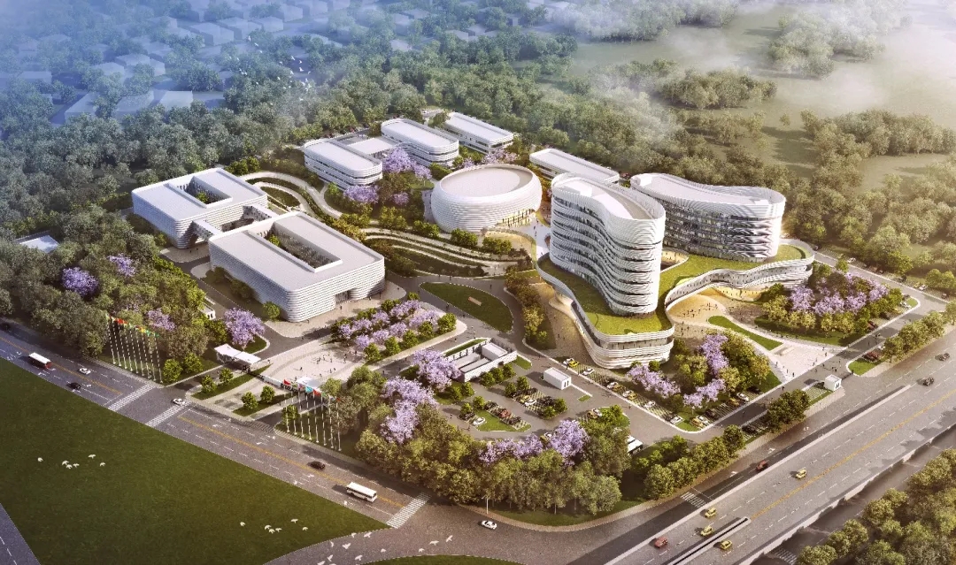 項(xiàng)目通過(guò)有機(jī)的建筑造型和景觀設(shè)計(jì),在中軸線上形成兩條交織的曲線,呈現(xiàn)動(dòng)感延展之勢(shì)。主建筑雙塔呈雙手托舉之勢(shì),與非洲疾控中心徽章完美呼應(yīng),象征團(tuán)結(jié)、博愛(ài)與力量。