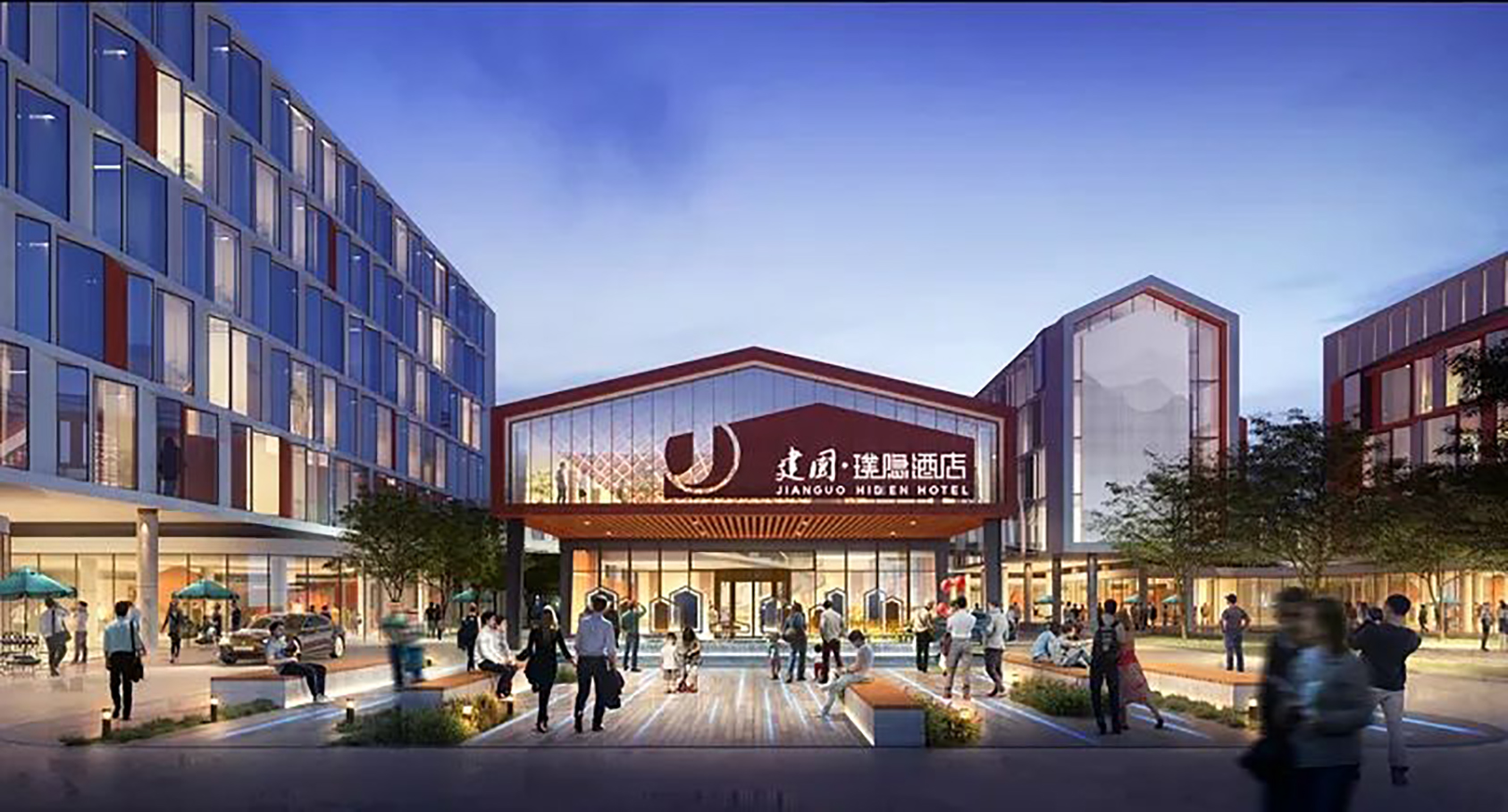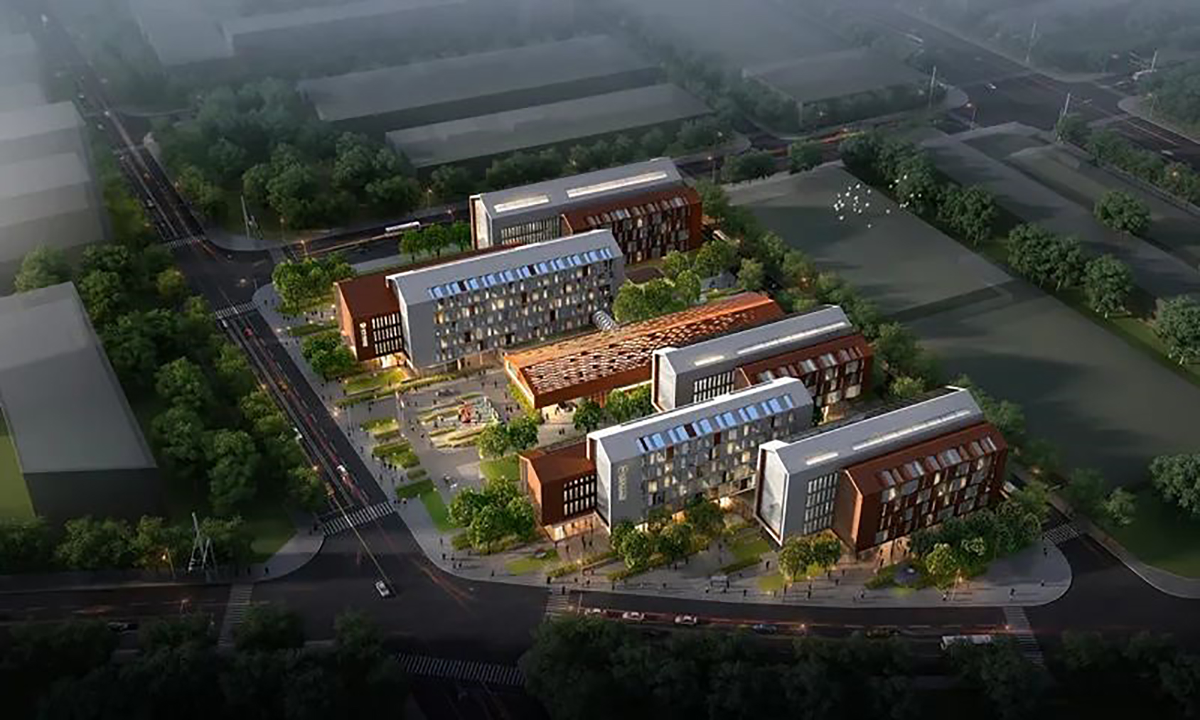 作為老舊廠房更新改造項目,首旅怡禾酒店將保留廠區(qū)原有的工業(yè)風貌,立面采用銹紅色與混凝土材質(zhì)搭配的玻璃幕墻,主體建筑采用4至6層坡屋頂交替布局,使原有工業(yè)設備和廠房煥發(fā)新生。場地設計延續(xù)了設計小鎮(zhèn)毯式街區(qū)理念,開放場地綠地景觀,北側與城市綠心公園形成緊密聯(lián)系,南側延續(xù)云鳳路一公里城市活力帶界面,助力設計小鎮(zhèn)綠色友好慢行空間連續(xù),打造融合型、開放性街區(qū)。